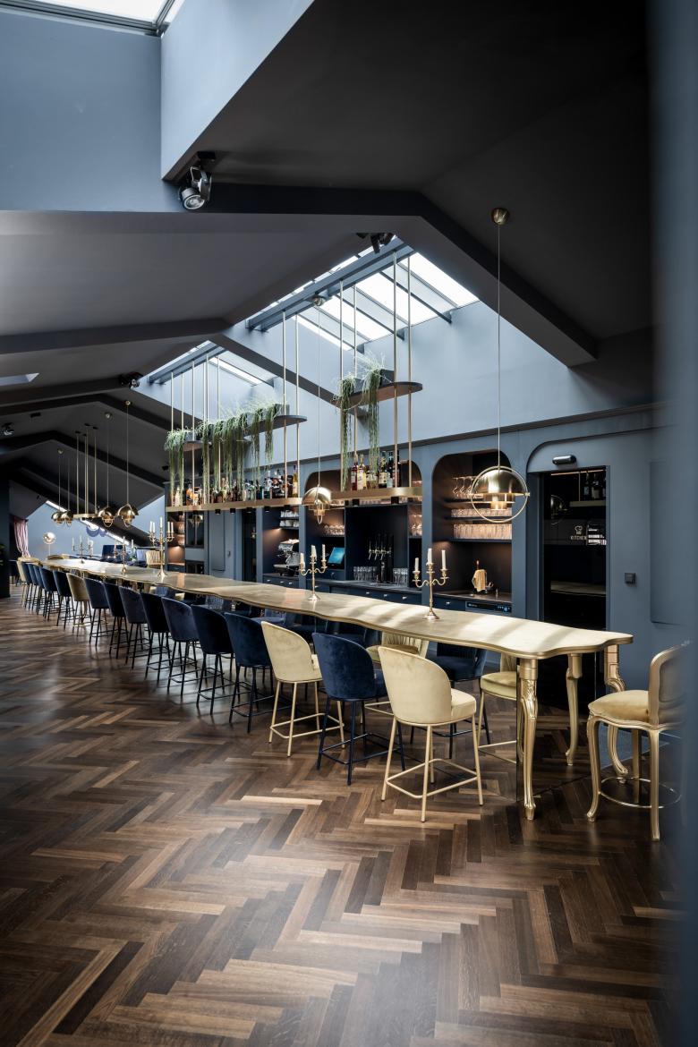 Guests are invited to begin their journey through time on the ground floor: the lift is accessed via a long corridor punctuated by two "mirror locks". Guests see themselves reflected, but at the same time any boundaries are dissolved by the mirrored walls and ceiling and the architecture ceases to exist. From the entrance itself, guests are transported away from their own sense of time. The lift takes them straight to the brand new sixth floor, where a warm welcome awaits. There, the first thing they will notice is a dominant piece of furniture in the long room: a 13-metre-long, custom-made brass table with baroque ornamentation. The table is a multifunctional reception, breakfast buffet, bar, and convivial meeting place in the evening, which is open to non hotel guests as well. The table is further enhanced by the smoked oak floor, and the brass provides a regal contrast with the warm dark blue saturating the room. Blue also features in the name of this iconic venue: “Zur blauen Brigitte” [Blue Brigitte], named after one of the building’s two owners.