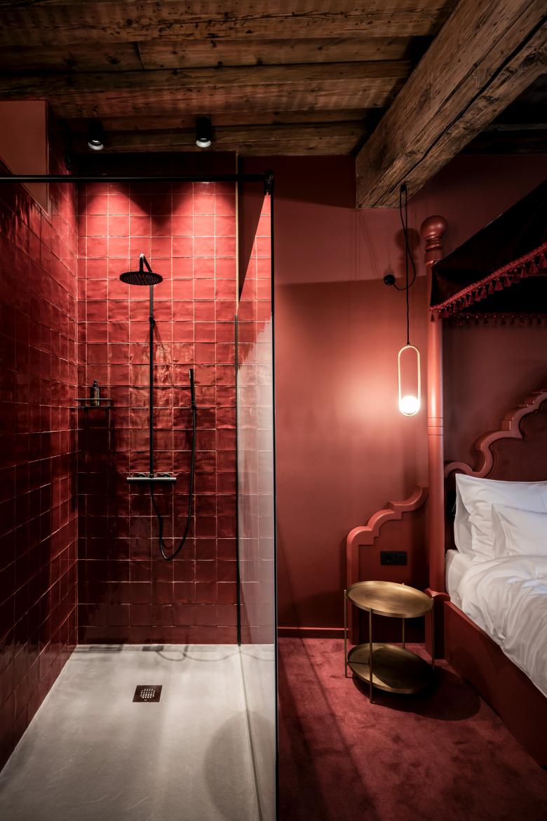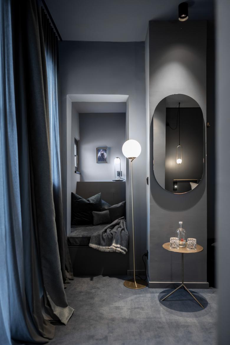 The rooms themselves have consistent colour codes. Each is immersed in a monochrome colour and becomes the setting for the baroque elements. Colour is part of the journey through time that the guest embarks on. Each hue gives an indication of the configuration of the respective room. When compared to the light blue rooms, the red rooms are slightly more spacious, the dark blue rooms have a balcony, and the green rooms have a terrace overlooking the courtyard, while the grey rooms are all twin-bedded. All the furnishings are in keeping with the colour: from carpet and tiles to wall colour, curtains and furniture. The baroque theme is reflected in particular details, for example, one leg of the washstand or a chest of drawers is always “baroquefied”, but it also shines through in other accessories. The baroque touch is further accentuated by a specially created series of photographs of opulently dressed ladies who pick up on the leitmotif of “Baroque Chic Shock” through whimsical accessories.