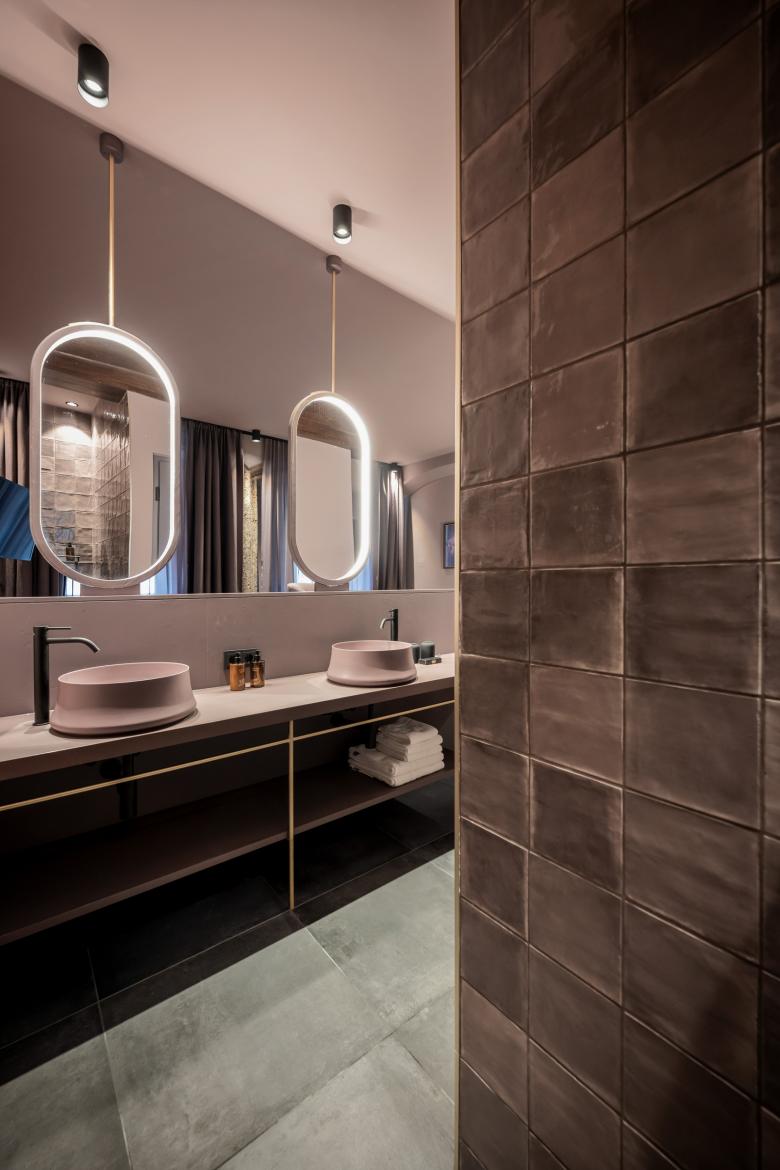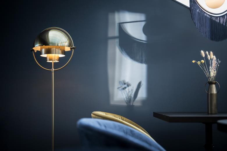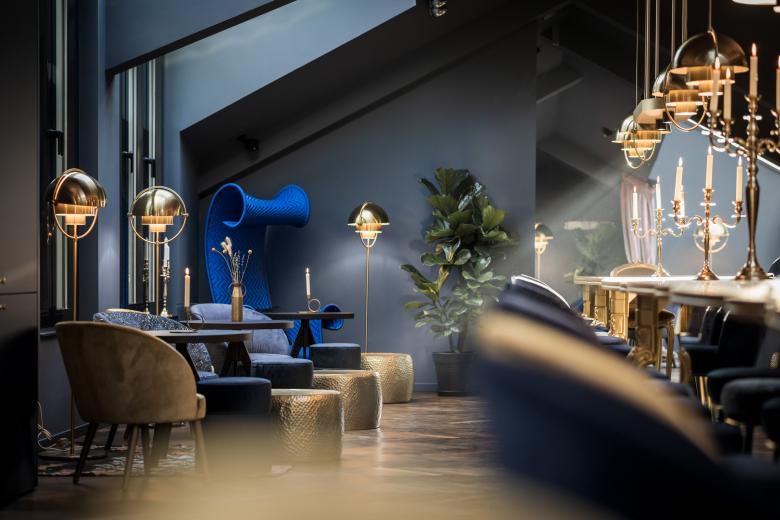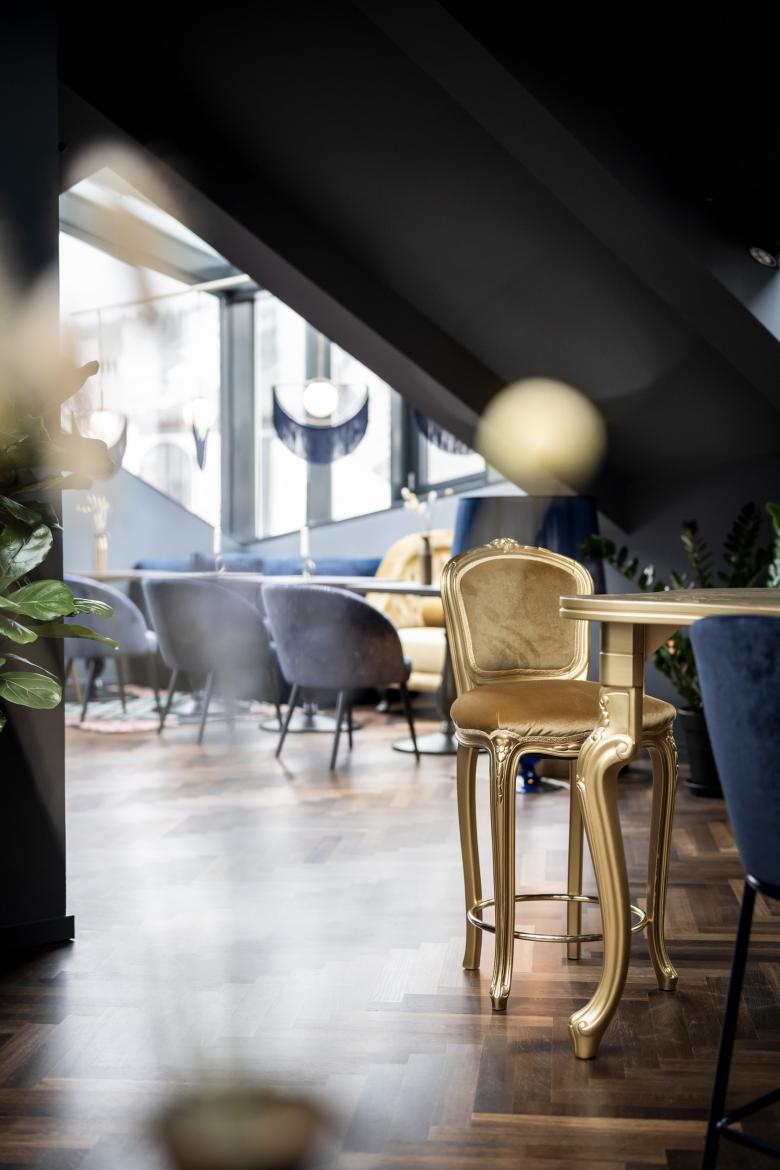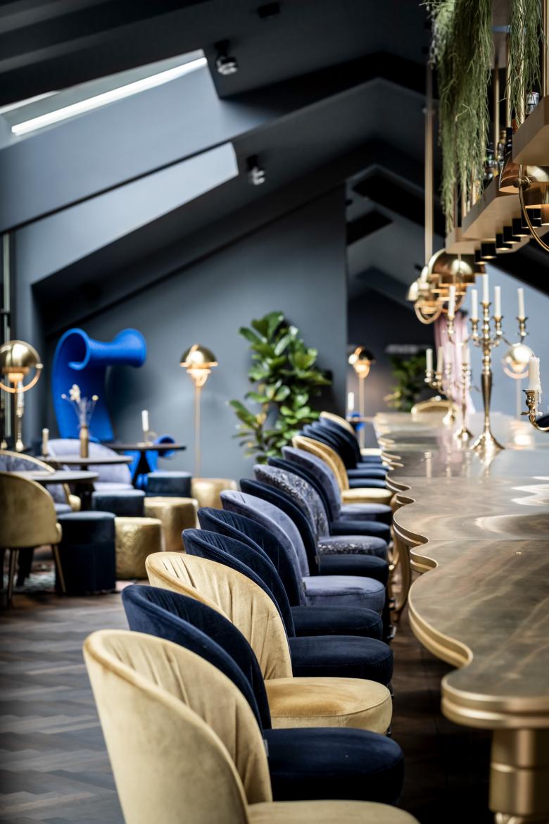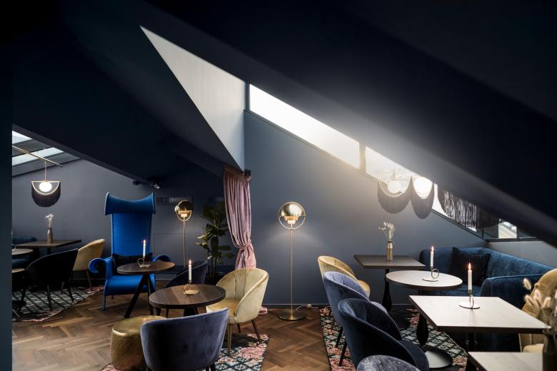 The blue loft, with its bay windows, glass alcoves and breath-taking views, is the opposite of "a cold atmosphere". Various seating areas with unusual armchairs and Gatsby-style lighting offer an eclectic ambience, where charming accents in light pink and ochre yellow tie in with opulent brass. Elements from a wide variety of stylistic periods conspire to blur any sense of time. The project's by-line – “Baroque Chic Shock“ – is evident by its varied and peculiar characteristics. Minimalism and white spaces are anathema here: everything has been colour-coordinated, right down to the technical details. This lively spirit is reflected in every nuance and evokes the building’s dynamic history, of which a new chapter is now being written.