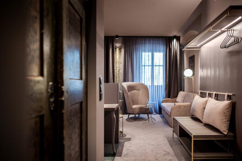 The first floor, which has been extended into the courtyard by six rooms, create a unique impact. All the rooms have an overhead glazed terrace and a spacious outdoor area. The highlight of this floor is the “Superpatio” room with its green jungle decor, a small green oasis with antique furniture and an unusual bed. Up one floor, on the second floor, is the “Mozart Suite”, a spacious retreat where Mozart once lay to rest. Here, grandiose elements abound in red and gold. As a tribute to the famous composer, who was a keen gambler, a billiard table graces the room. A further curiosity can be found on the third floor: a “broom cupboard”, the smallest room in the hotel, which remains completely unfinished. With its unplastered walls, it is the “unstyled” centre of an otherwise meticulously designed iconic hotel. As a complete one-off, the signed tennis racket of a famous Wimbledon champion adorns the wall. The fourth floor extends into the neighbouring building – the Frank House – which has a further 10 rooms. On this floor is the “Golden Roof” room, with its opulent gilded furnishings. It was named after the Golden Roof, which can be seen from the bay window.
