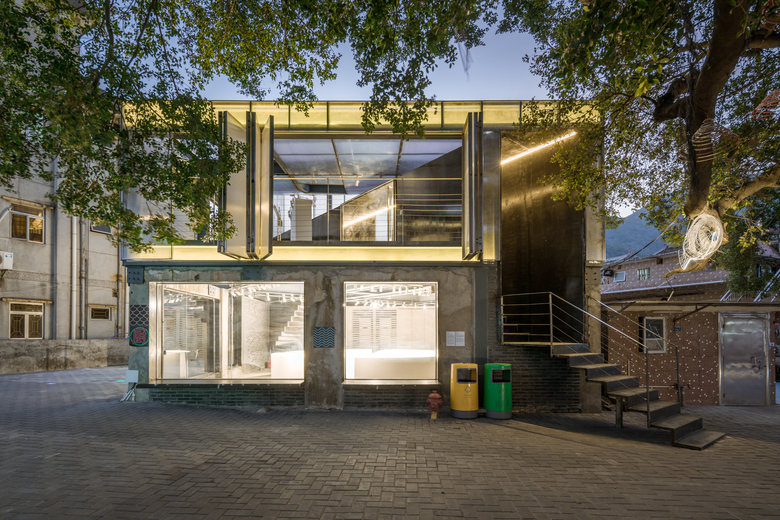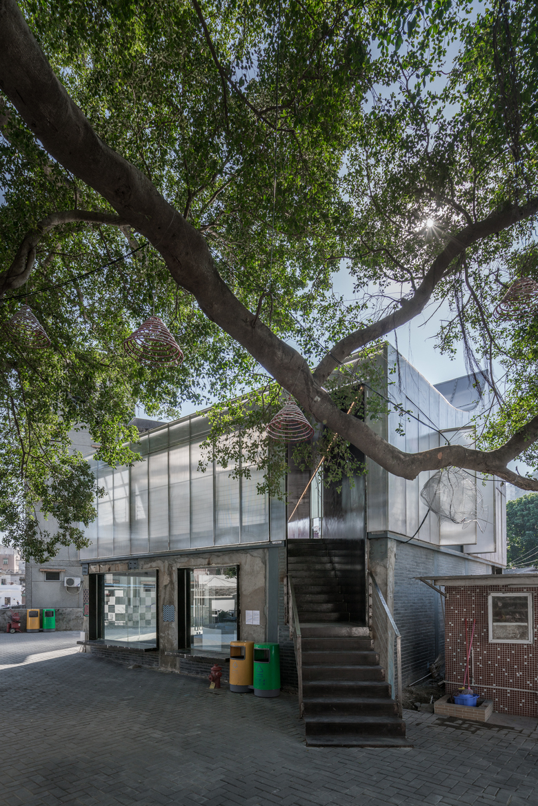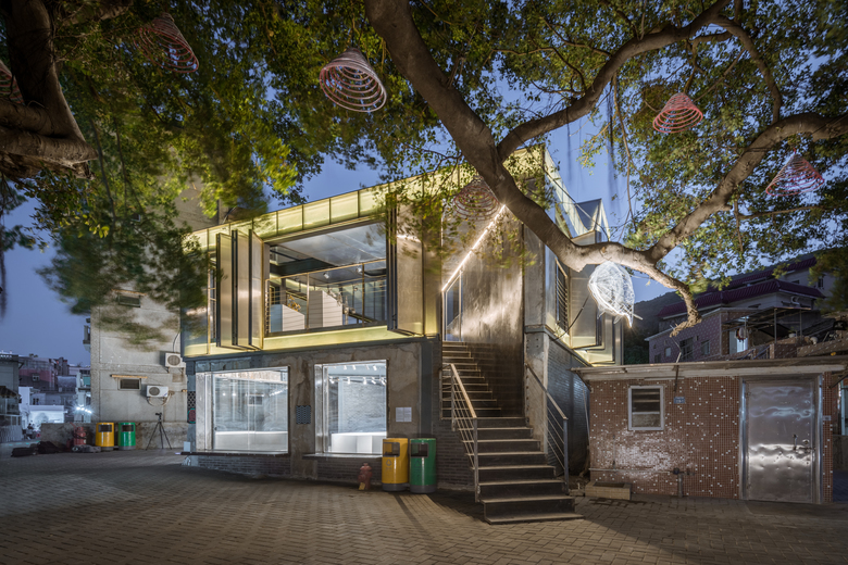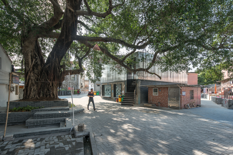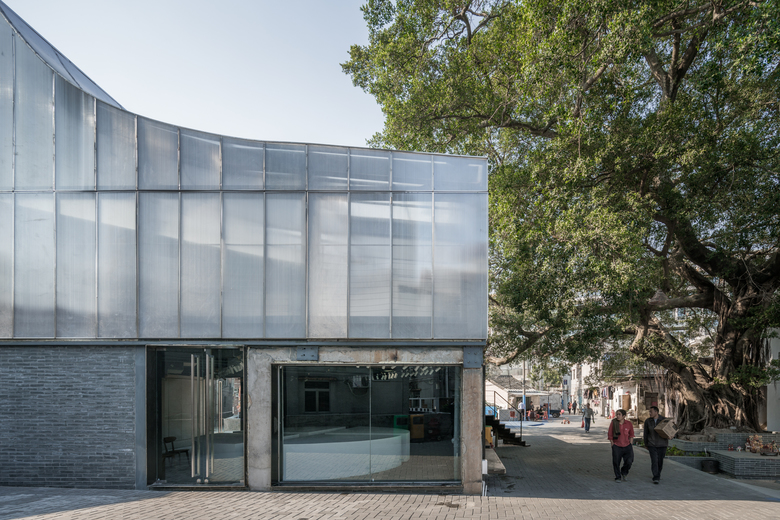 House 10, originally a frame-structure single-floor building, is renovated based on the existing conditions and topography as well as the design concept of interconnection, integration and transparency. "interconnection" -- with diagonal stairways embedded into existing building, alleys and Banyan Square are interconnected, continuing the typical feature of alleys in urban village to be accessible from all directions. "Integration" -- the original frame structure on F1 is retained as the basic building structure, from which a new F2 is added. The curved roof and skylight echo with the banyan at the shrine from a distance, reinforcing the sense of place. "Transparency" -- transparent sunlight panels reduce the massiveness of the building, while the interior and exterior building spaces mutually penetrate into each other. The light and transparent facade of the added F2 and roof constitute a sharp contrast with the massiveness of the original concrete structure.