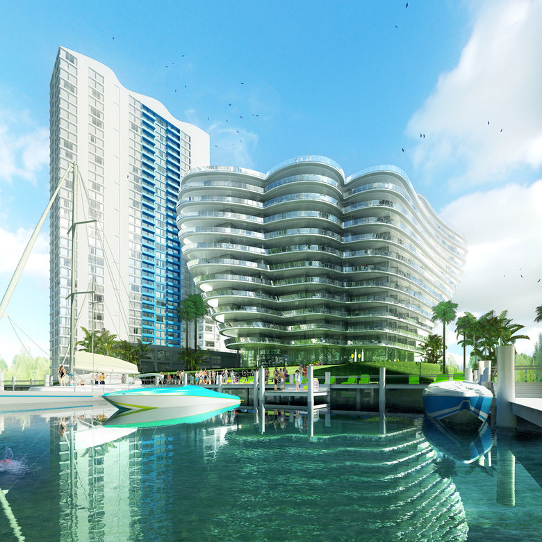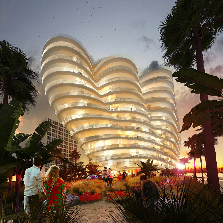 When designing a residential building looking out into Biscayne Bay in Miami, maximizing views and sunlight with outdoor spaces for as many units as possible is essential. In order to create such a structure, short facades were stretched to fit three waterfront apartments, adding an additional unit than the typical waterfront block. Lower FAR was raised to the top, and the structure was shifted into three slanted and rounded sections to express each apartment's outdoor space. The landscaped base provides residents with amenities and viewing decks, as well as a common place to interact and enjoy.