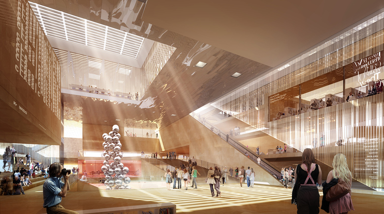 Protected by the monolith, a public plaza located directly opposite the Parliament building marks the beginning of a journey of learning. Stepping into the excavated space of the mountain, visitors have several choices. Climbing the mountain, visitors discover a mix of events including permanent and temporary exhibitions. Venturing below, visitors can learn about the treasure collections and have a glimpse of the building’s operating systems. Throughout the journey, light acts an attractive force, sequentially intensifying and ebbing to orient and guide visitors.