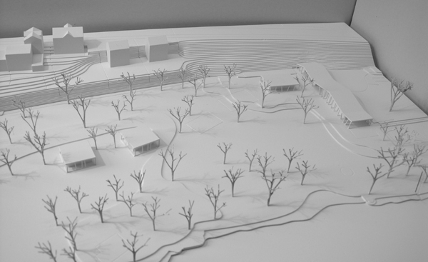 Die Gestaltung der Neubauten orientiert sich am Ort und ergänzt mit den schrägen Holzstützen die Parklandschaft der Baumstämme. Dadurch integrieren sich die Gebäude im Gesamtbild und lassen die eigentlichen Fassadenflächen in den Hintergrund treten.