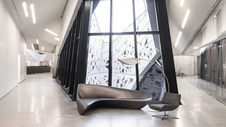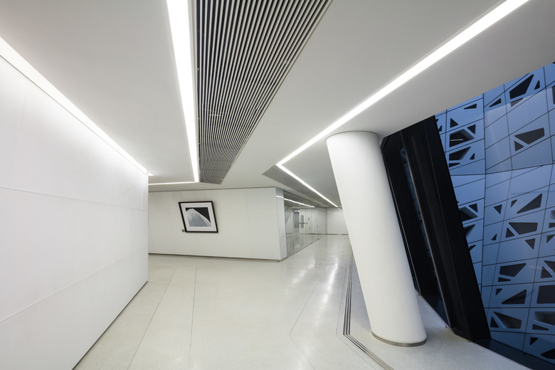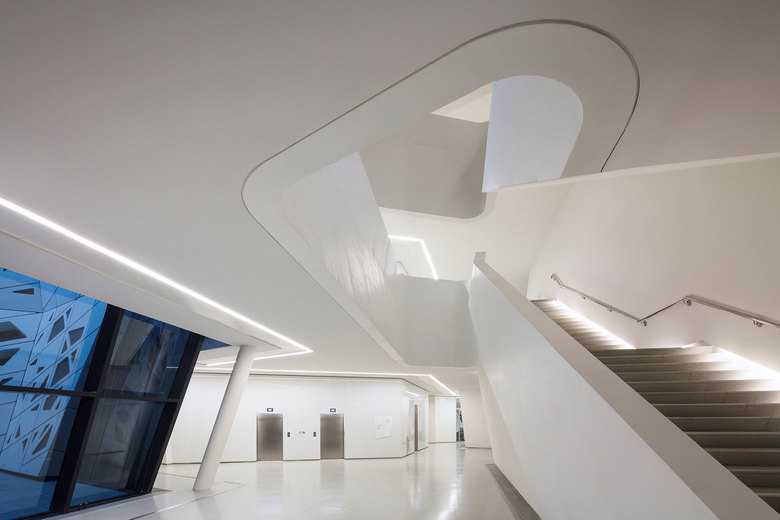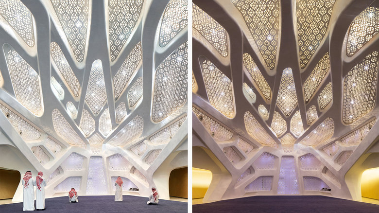 As an avant-garde icon, the KAPSARC building complex creates a striking impression on land and in the air, visible from both cars driving into Riyadh and from planes flying into the city. At night, the folded, honeycomb structure is visually sculpted by a gradation of light, with differing intensities of light and shadow underscoring the interlocking, multi-dimensional cellular forms. A masterplan of energy efficient lighting is implemented throughout the 51,000m2 (548,960sq.ft.) building complex to meet its LEED-Platinum goal, a first-of-its-kind in Saudi Arabia.