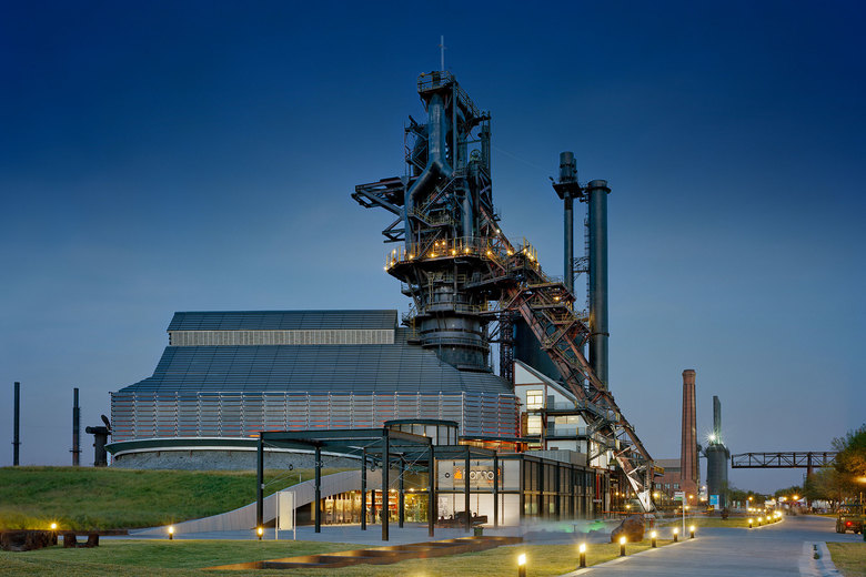 Lighting for the Museo del Acero, a restoration of a decommissioned 1960s blast furnace, creates a nighttime identity for the structure evoking its former life. Violet and amber tones light the monumental structure at night, evoking the smoldering hues of the original blazing furnace. Floodlights illuminate larger scale elements, while exposed, low wattage lights add sparkle at the terrace and catwalks.