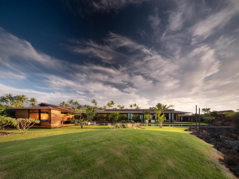 This family retreat on Hawaii’s Big Island takes the form of several canopy-like pavilions dispersed around the site, linked by elevated wooden lanais and a series of gardens. Hale Lana, which translates to “floating home,” appears to hover over the site’s lava fields and dense gardens. The home takes a position at the ecotone line between the heavily landscaped area, and the expansive ocean views which stretch to Haleakalā volcano on nearby Maui. The ultimate design goal was to balance transparency and enclosure to create a home that would function for the couple, their extended family, and for large gatherings, while maximizing connection to the Hawaiian climate and landscape.