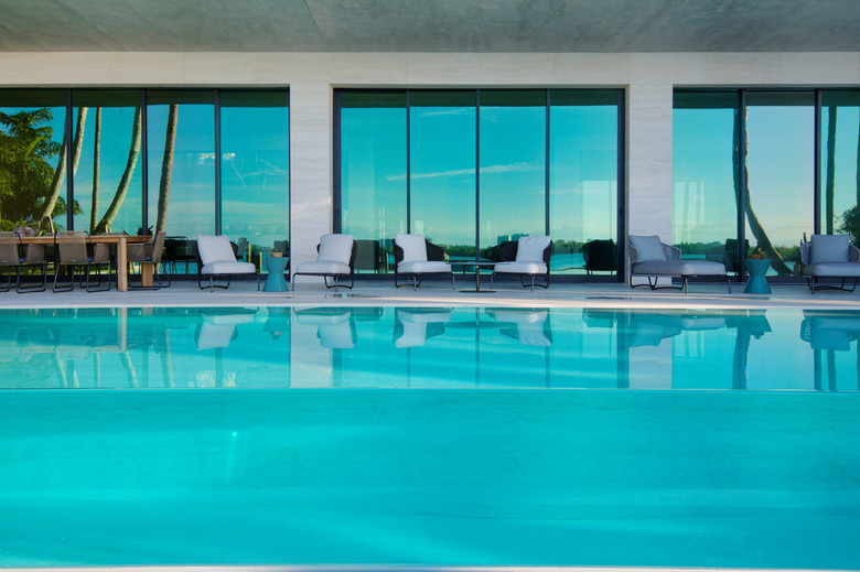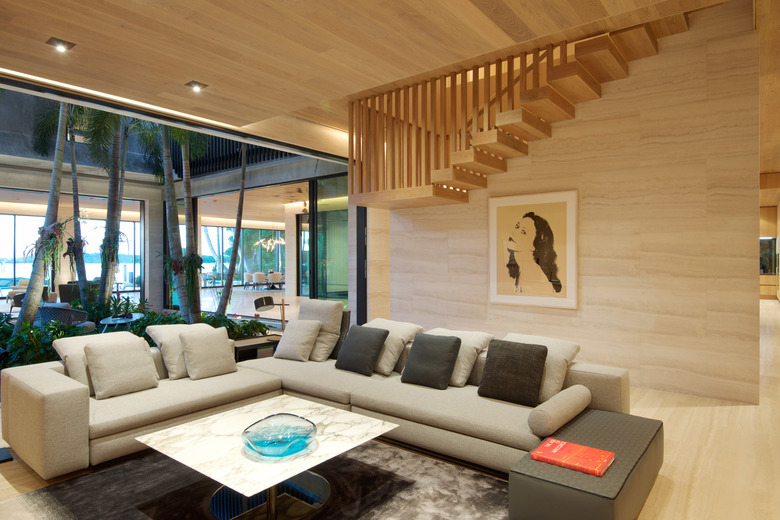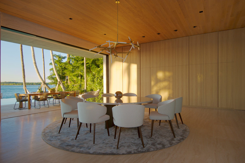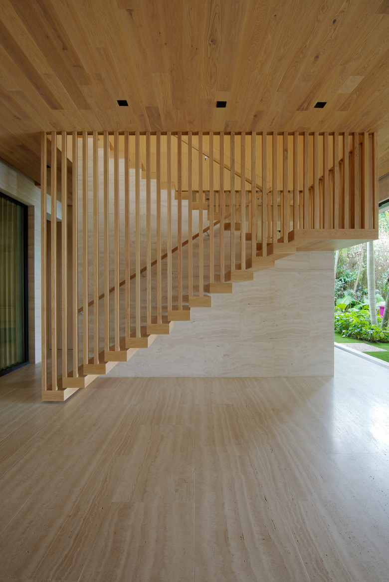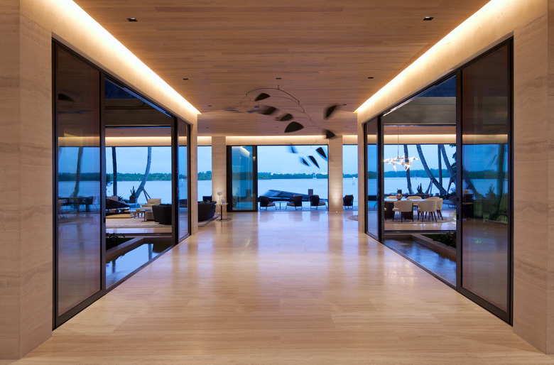 From the arrival in the car court with concealed stone garage doors to the main entry flanked by travertine reflecting pools, through the interior of the house, a continuity of material is maintained. This reinforces interplay with the landscape where interior and exterior become indistinguishable. The living, dining, entertainment, and service areas have immediate connections to interior courtyards through sliding glass panels that disappear into travertine clad walls, maintaining constant reference and visibility to the bay. The covered exterior deck and pool are also finished in travertine, maintaining a fluid connection that culminates with a glass-walled pool, creating a sublime interplay with the bay.