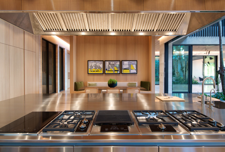 The home is designed within volumes that shift to create a sequence of courts. Base volumes clad in stone shift beneath the upper concrete volumes. These are detailed to preserve the purity of the elemental forms through restrained materiality of concrete, travertine, and custom finished wood.