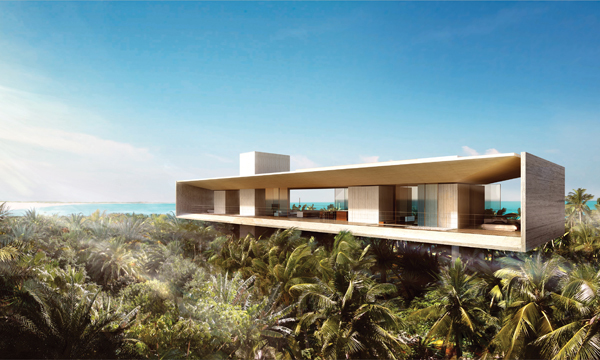 A private island in the Turks and Caicos is being transformed into a laboratory of contemporary architecture by visionaries Zaha Hadid, Shigeru Ban, David Chipperfield, Carl Ettensperger, Kengo Kuma, Chad Oppenheim and Piero Lissoni. Oppenheim was selected as one of 7 architects to create a series of villas for the Mandarin Oriental Group. The design for the 8 villas emerges from a profound admiration and hyper-sensitivity of Dellis Cay's unique natural setting. The intention is to integrate nature as a major ingredient of the material palette. The architecture is reduced to the essential components for shelter—amplifying the ever-changing sky, water and vegetation that define the experience. As the 8 villas are located on the only interior parcels of the island, they are elevated over the treetops to maximize exposure to the wondrous nature about-- taking advantage of the views towards the horizon and framing its surroundings. Their elevated position allows for them to have little impact on the ground plane allowing the undisturbed natural landscape to flow under them as an integral part of the design. The tree-top villas are precisely orientated on their parcels to maximize their performative and experiential qualities, channeling prevailing winds to cool the interior spaces as well as framing sunrises, sunsets, and the path of the moon on either side of the structure. Resources are limited in the island, passive and active mechanisms have been proposed-- such as large overhangs, cross-ventilation, use of reclaimed materials, solar hot-water, an insulating green roof, and a rooftop infinity edge pool that doubles as a rainwater collection tank.