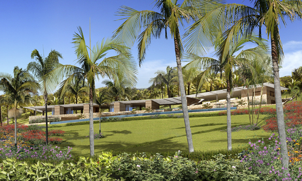 As you turn off one of the main island roadways you confront a compressed experience traveling between stone retaining walls overflowing with vegetation. A small carve-out and a transformation of ground surface material from concrete pavers to cut stone signifies a sense of entry and location for mule parking is obvious. Framed by large, flowering canopy trees, a stone portal of distinctive proportion surrounds a wooden door rich and simple in texture. On crossing through the threshold one encounters a spectacular vista framed by an intimate courtyard with a central water feature that feeds a small channel surrounded by carved benches primitive in nature. Shoes off, one enters the home on access with a majestic tree surrounded by floating stairs both ascending and descending. To the left are public living spaces, while to the right are the private living quarters. Materials in the house are comfortable, distinctive, and sincere. Smooth finished concrete floors, off white in color, flow through the open spaces juxtaposed against weather worn teak shutters, and decks. The living area is expressed as an open pavilion between landscape and view. Furniture is low, sleek and incredibly comfortable-made of incredibly rich material; yet simple in form. Decorative screens divide individual moments in the room providing opportunities for private dinning. A utilitarian kitchen and service area set forth a sense of enclosure.