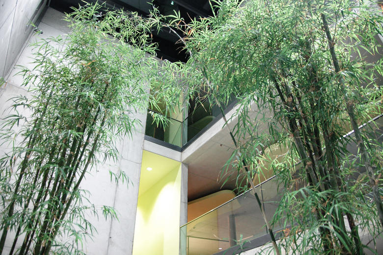 Vollverglaste, weit in die Landschaft ragende Arbeitsplätze und ein innenliegender Bambusgarten für Teambesprechungen betonen die nachhaltige Strategie des Unternehmens.