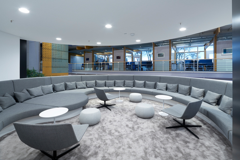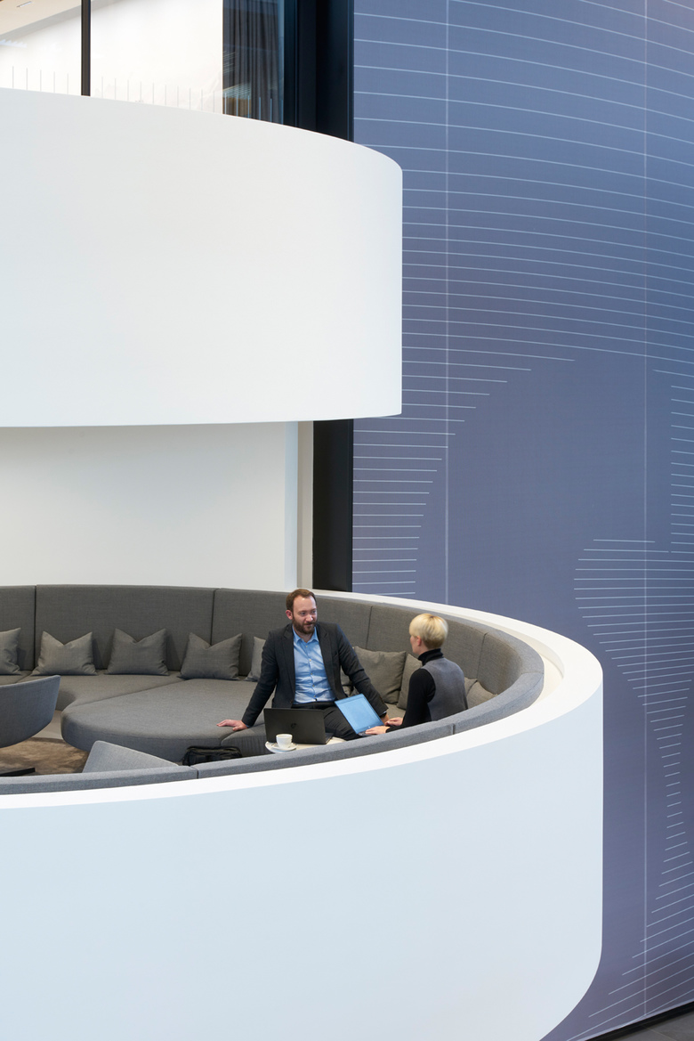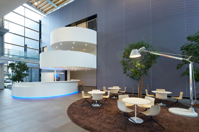 Neugestaltung der großen Empfangshalle zu einem weitläufigen Kommunikationsbereich mit Konferenzräumen, Besprechungs Loungen, Kundenempfang, Produktausstellung und Espressobar. Diskusförmige Plateaus ragen aus der Screen – verkleideten Fassade der Produktionshalle in den 4 – geschossigen Luftraum: Offene Kommunikationsebenen für den fließenden Austausch zwischen den Unternehmensbereichen.