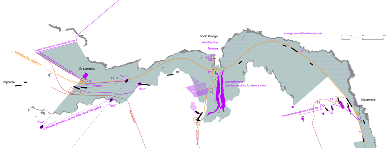 The coast of Siracusa presents a stimulating conflict between the urban and the geographical scale. We recognize the broad dimension (and its local effects) as prevailing. Our intention is rebalancing the spatial dialectics by influencing on processes (both environmental and perceptual). This is a chance to overcome any social and physical blight of the public spaces.