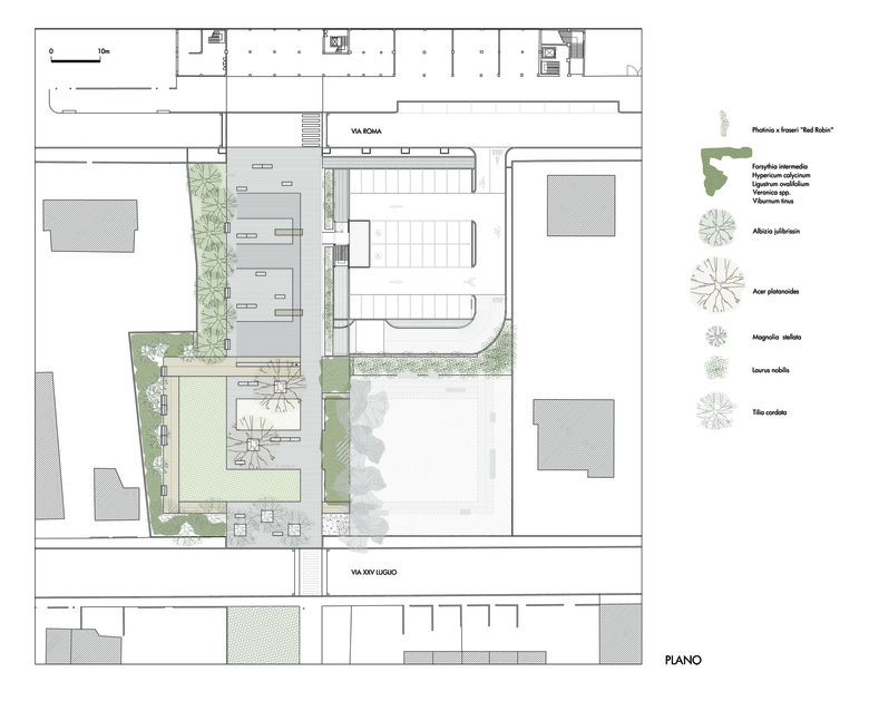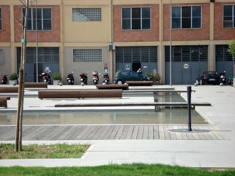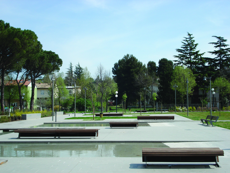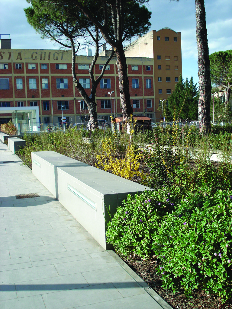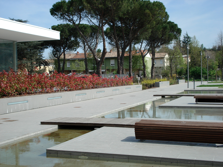 The public square and garden along the via Roma, in Morciano di Romagna (Rimini-Italy), is part of the works defined within the Urban Reclamation Plan for the complex which formerly hosted the Ghigi pasta-factory, located near the town centre. The project plans to convert the disused factory to new shops, houses and offices. The implementation of the proposal is based in two topics: - the will of linking the new filed to the urban compact pattern of the central area, featured by the spreading and continuity of the commercial system and by the continuos edification along the streets that end in the ex-factory’s area, where the town acquires the nature typical of the city-garden. - the possibility of “opening” the factpry, corssing it with a new pedestrian axis that would join the historical centre, the Marecchia river park and the natural context of the sorrounding hills. In the frame of the Urban Reclamation Plan, a wide part along the via Roma has been destinated to a subterranean parking area and a square/garden crossed by the pedestrian axis. The vegetation defines walls that divide the square from the adjacent spaces (private gardens and parking areas), vice versa the square contours are open by the entrance from the urban streets, to create a more closed and intimate space but fluently related with the surrounding context. The square (which covers the underground parking) is created through a minor terrain-modelling, a slight tectonics, made up of stones, consisting of parts below and above the water level, similar to artificial banks. The garden starts where the parking architecture stops and the ground becomes natural soil, providing the vegetation with optimum conditions to grow. The layout of the square and garden is conceived as a cadenced succession of simple-shaped sectors running along the pedestrian path, characterized by different materials, textures and lights. Some sectors are sunny and dry, others are wet, others more are made up of simple grass with isolated trees and their shadows.