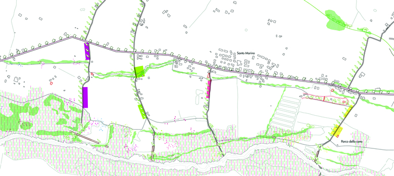 – Strengthening all the access ways to the river by a site specific re-landscaping and a new management of the country roads (to be shared between public and private stakeholders), making more evident all the paths which start from the main road (via Santarcangiolese) and penetrate to the river area through a sort of comb-shaped structure. These ways, almost perpendicular to the course of Marecchia, guarantee a direct and immediate approach to the river and to the cycle/foot paths which develop along it.