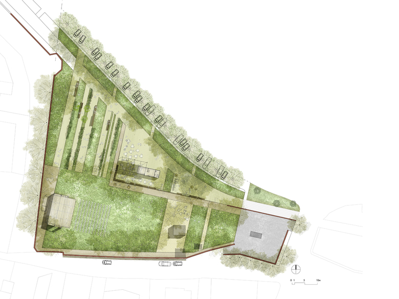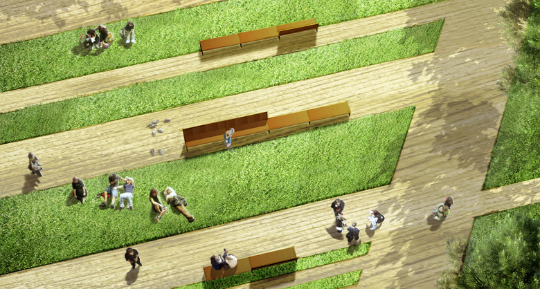 The general design of the proposal clarifies and reinforces the presence of two main sections with complementary uses, which can be identified by their different surface types. The first is covered with grass and features a number of concrete paths.