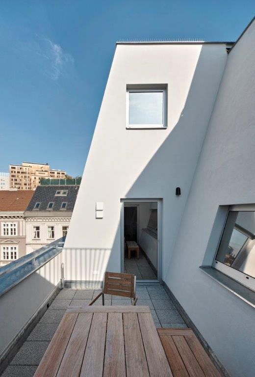 Zur Erschließung der 4 Wohnungen führt eine hofseitige Freitreppe ab 3.OG, sowie ein neuer Lift installiert zu  einem gemeinsamen, offenen Vorplatzbereich im Dachgeschoss, von dem aus die Wohnungen erreicht werden.