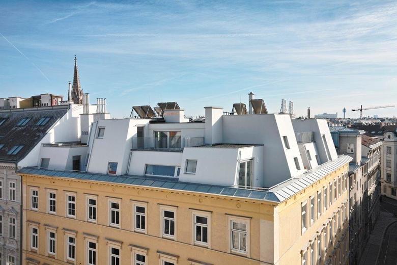 Eine höchst lebenswerte Form der innerstädtischen Nachverdichtung: eine Baugruppe rund um den Sohn des Hausherren nutzt die Ebene des Dachbodens eines typischen Gründerzeithauses als Baugrund in bester Lage. Vom Straßenraum aus kaum sichtbar, entfaltet sich in 16,0m Höhe eine eigene Welt mit Aussicht über die Stadt.