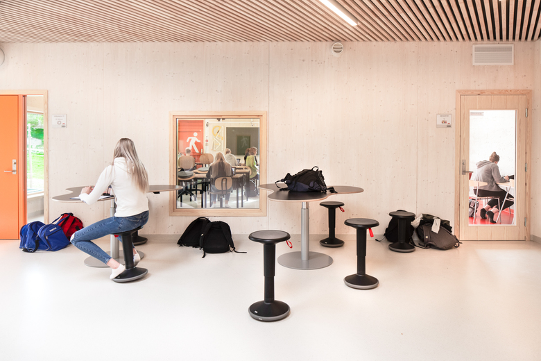 Das Forum, obwohl umgeben von den Klassenräumen, hat – dank rotationaler Anordnung – direkte Fenster nach außen, Ausblicke und Tageslicht. Auch die Bildungsräume beider Etagen haben unmittelbaren Zugang ins Freie. Das Konzept der Blickverbindungen setzt sich von außen nach innen fort: visuelle Verbindungen zwischen den Nutzungsbereichen stellen die Grundlage für einen offenen Unterricht dar. Es besteht in alle Richtungen der Blick nach außen, zum Schulhof und der umliegenden Landschaft, Fenster und Nischen ermöglichen den Blickkontakt zwischen den Unterrichts- und Gemeinschaftsräumen.