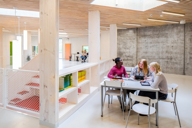 Die Bibliothek im Erdgeschoß dient einerseits als Erweiterung des Forums, andererseits als Verbindungselement zwischen Sekundarschule und Administrationsgebäude. Sie ist mit großzügigen Fenstern ausgestattet, sowohl nach außen in den Schulhof als auch zum angrenzenden Bildungsraum.