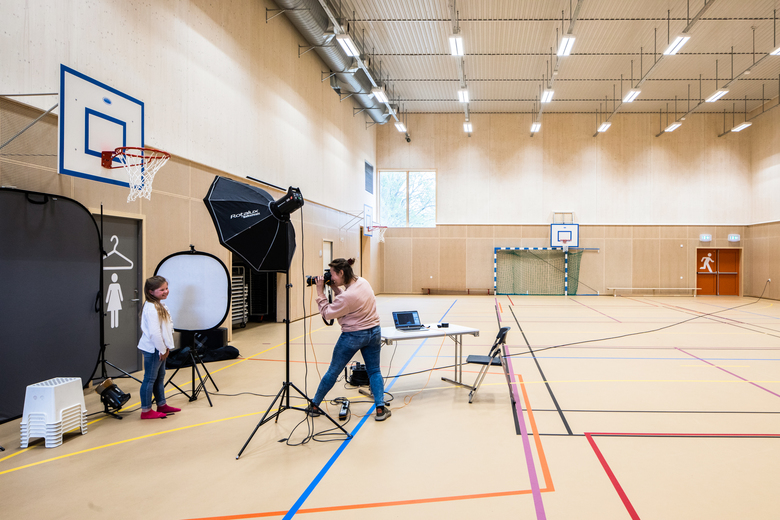Der Haupteingang im Erdgeschoß der Schule wird mit der angrenzenden Turnhalle geteilt, die neben ihrer Funktion für Sportaktivitäten sowohl als Mehrzweckraum als auch für außerschulische Aktivitäten der Gemeinde genutzt wird. Hier finden Versammlungen und Elternabende genauso wie informelle Zusammenkünfte außerhalb des regulären Schulbetriebes statt. Die zentralen Garderoben befinden sich in den Eingangsbereichen des jeweiligen Stockwerks.