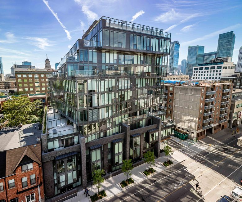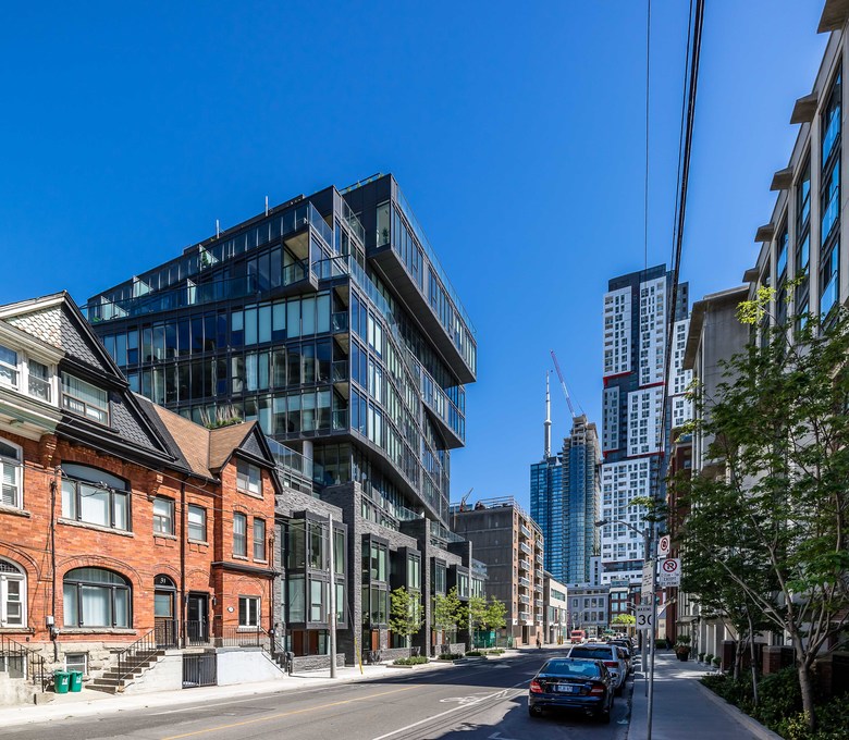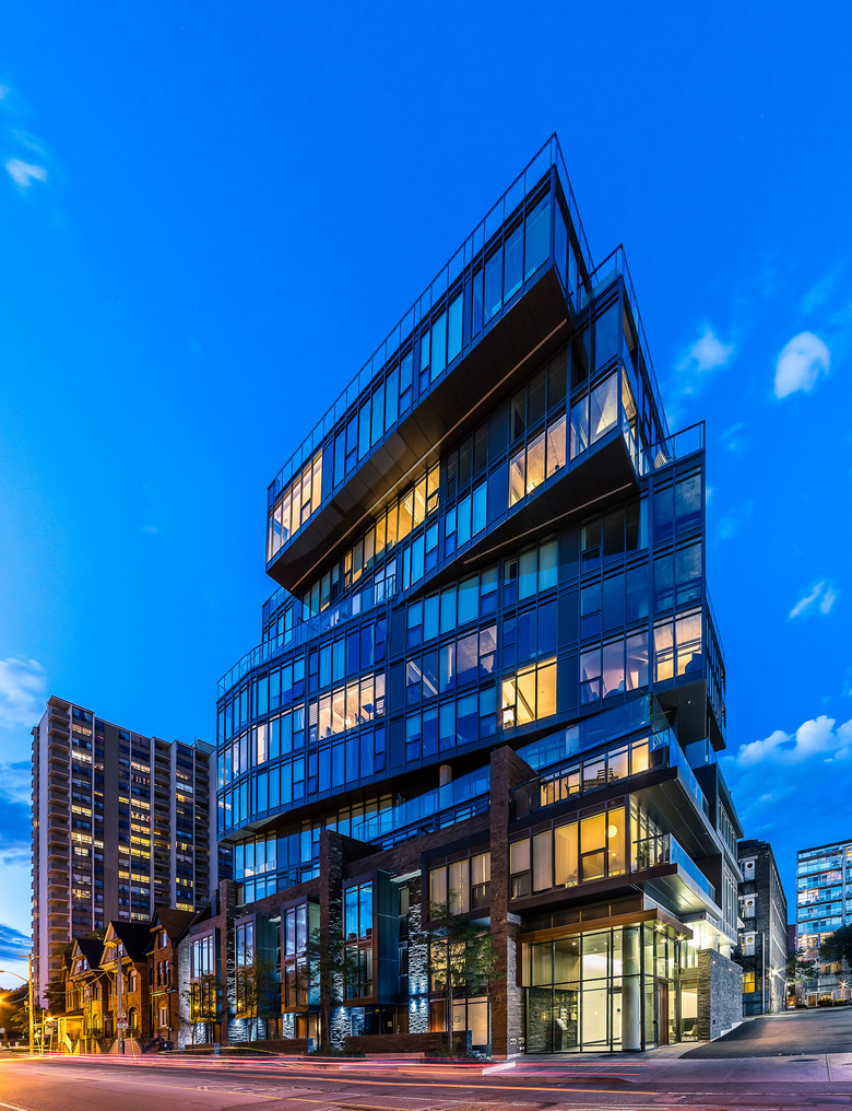 12 degrees was designed as an urban infill project, fitting into the context of a mixed use residential area where the city block has buildings that include both the Art Gallery of Ontario and the Ontario College of Art and Design.