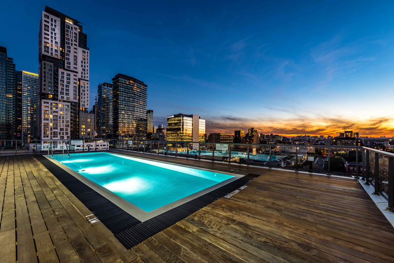 The upper levels of the building are arranged to provide for approximately ten units per floor, many featuring balconies afforded by the skewing massing. The top of the thirty-two meter high building has two penthouses; one featuring a six hundred square foot terrace. The top of the building also has amenities for the entire condominium including a seasonal swimming pool and a large terrace offering unparalleled views of the Toronto skyline.