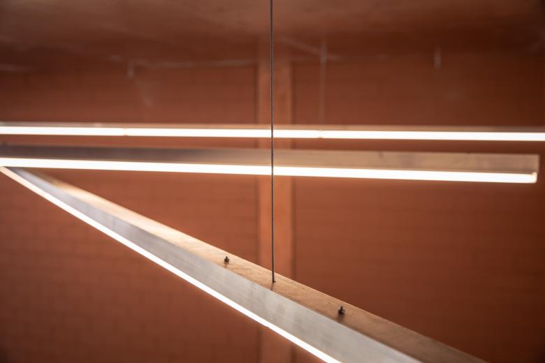 The second light-hack is a series of light lines composed of standard diffuse linear modules and aluminum profiles, hanging on different levels within the space. These lines provide both lighting to the mezzanine and the ground floor level. At the same time, the light lines play with the height of the space and so catch the eye from afar. In this way, the lighting design communicates the visual and minimal language of this creative studio.