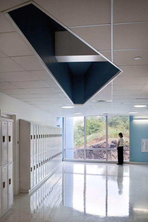 Jettisoning the conventions of New York City school construction, we used precast concrete plank and steel for the structural system because it was less expensive, faster to build, and, in conjunction with exposed mechanical systems, allowed for higher ceilings and more spacious classrooms. Instead of the usual costly masonry exterior, we chose light-weight industrial colored metal claddings to mark the different academies. A small expanse of blue polished tile and glass highlights the special shared rooms for music and science, appearing like a beacon for the ambitions of the school.