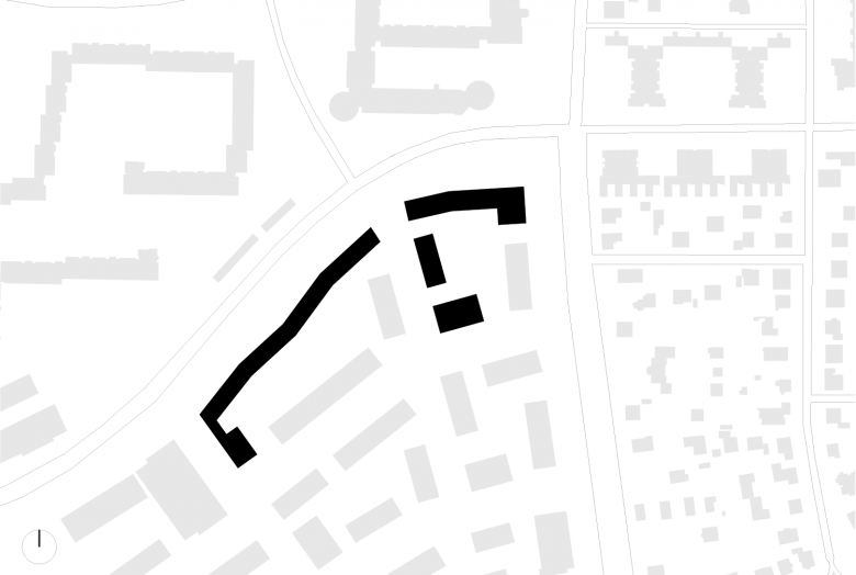 A landmark building, shaped to follow the bend of the road, forms the entrance to the neighbourhood. Behind it, a lively group of buildings opens up - different types of housing are arranged around urban greenery. This creates a place where people of all ages can live together, surrounded by nature, with space to meet and connect.