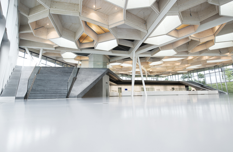 The roof structure was developed with the renowned Stuttgart-based structural engineer Werner Sobek. The intention was to create a polygonal leaf-like canopy that achieves long spans over groups of columns. The structure combines a steel frame and columns with a glulaminated wood-cell infill. These wood cells are functionally “coded” and constructed either as skylights with solar-glass, as perforated wood acoustic planking, or as artificial lighting cells modified by an aluminum-honeycombed deflector. In order to economically achieve this highly complex structure CNC routing and sawing was employed to accommodate the more than 300 unique honeycomb joints.