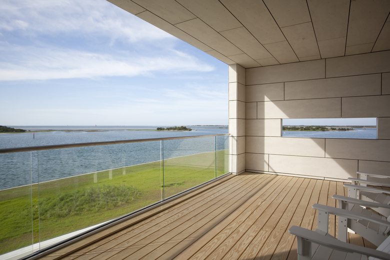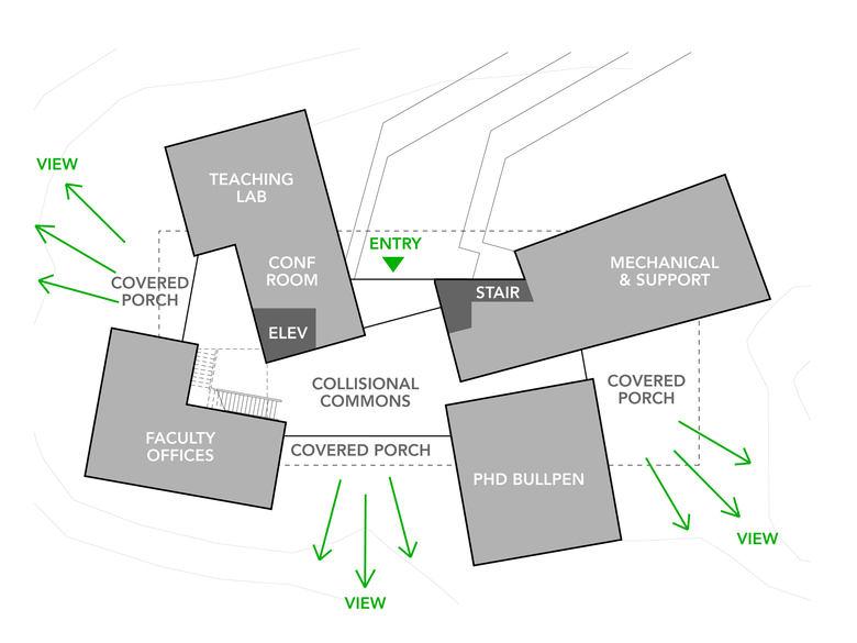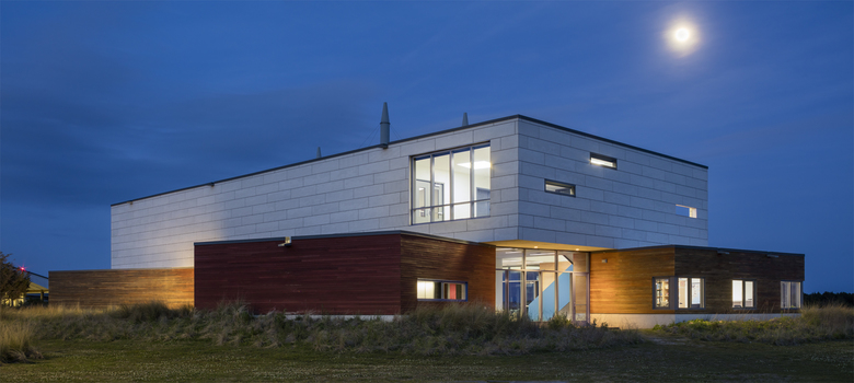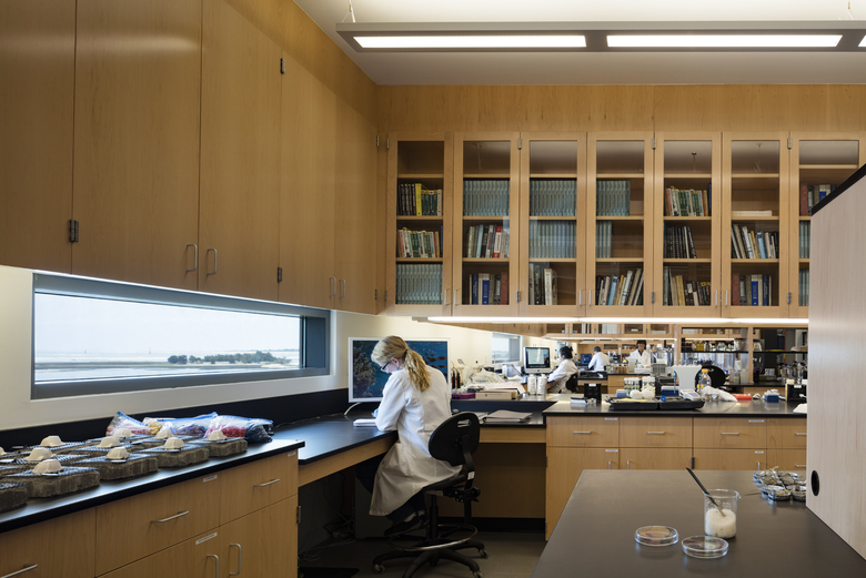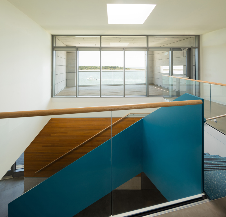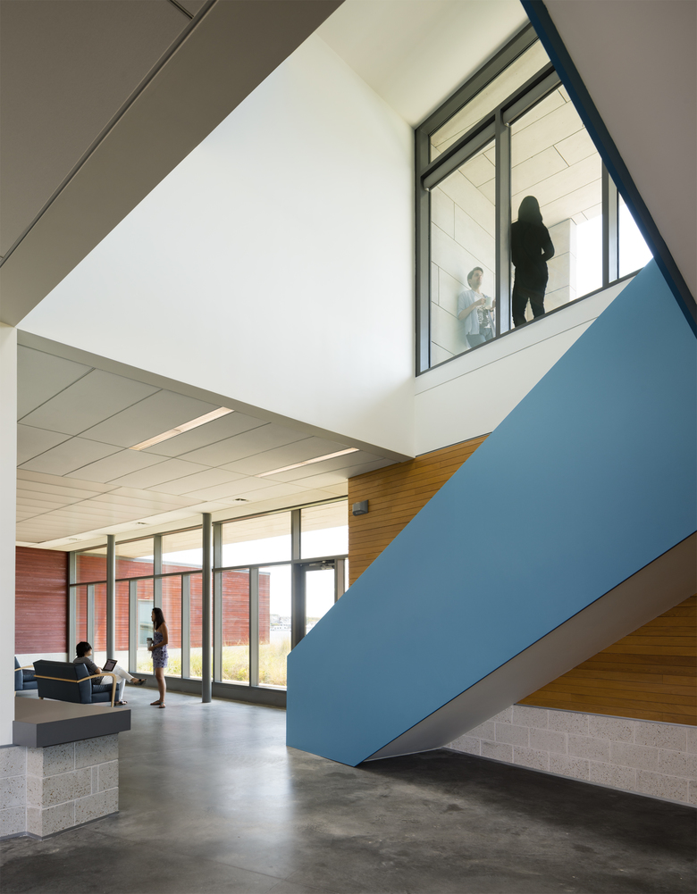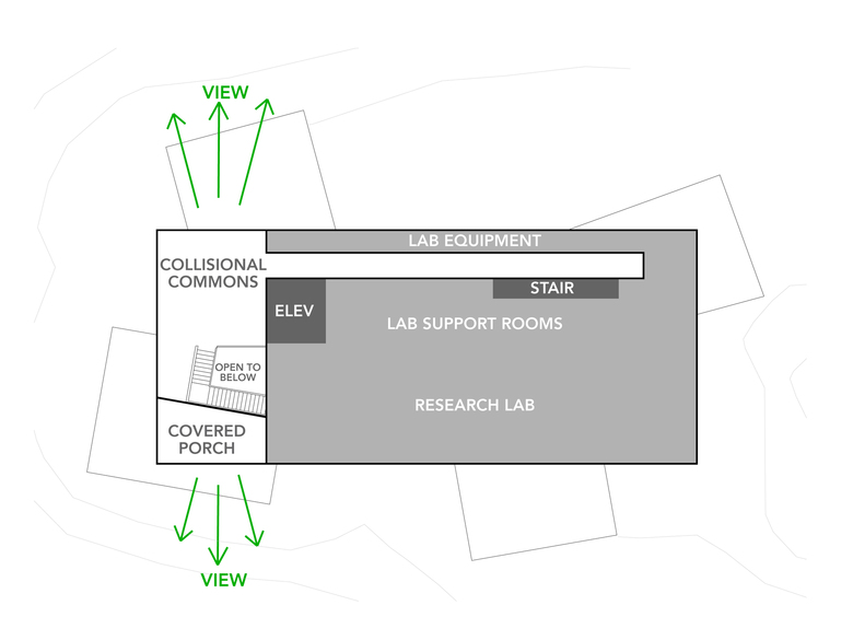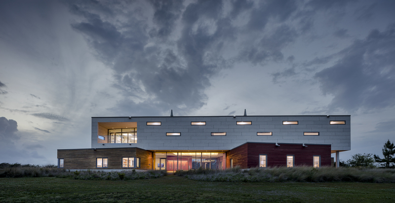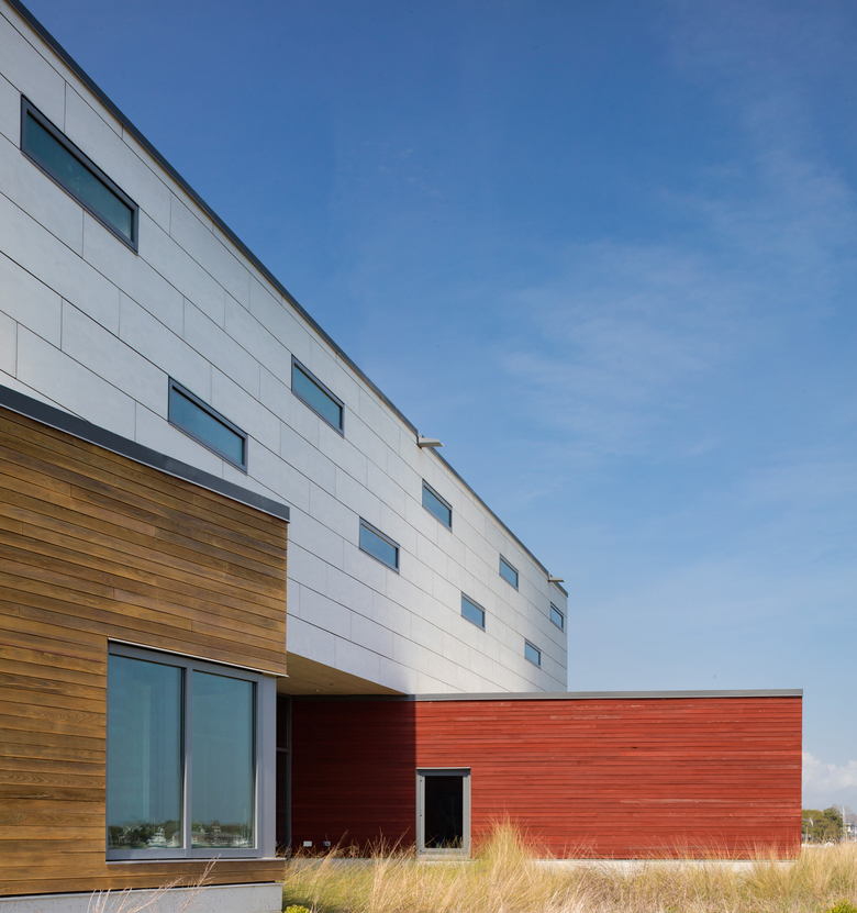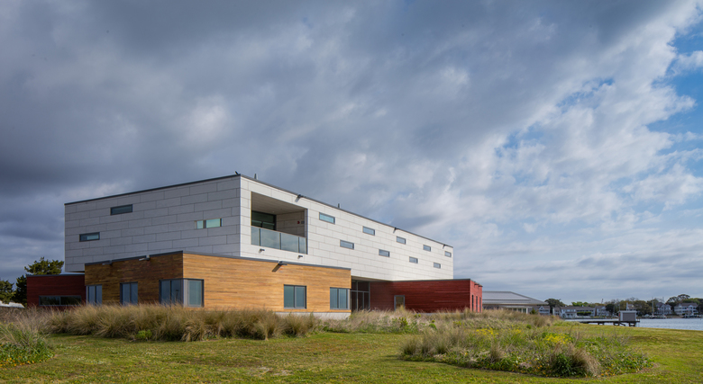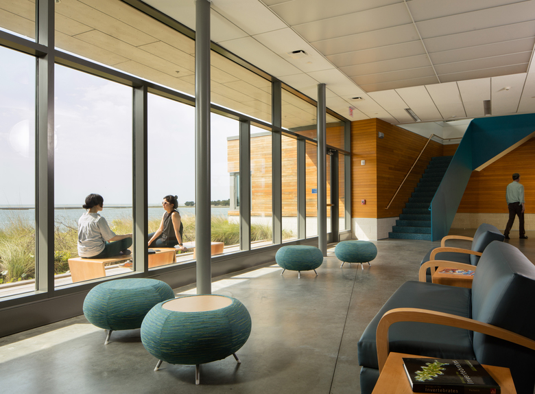 The first floor contains a collaborative "Collisional Commons", surrounded by faculty offices, a PhD bullpen, teaching lab, video conference room and service spaces. Clad in wood and large expanses of glass, it reflects the architecture of the original campus quad built in the 1930s while opening up dramatic views to the coast. The second floor is a 'laboratory loft' that houses equipment-intensive research spaces, and features an elevated deck with views to downtown Beaufort and surrounding islands. Protected by a modern panelized system, it conveys the scientific and forward-thinking research taking place within.