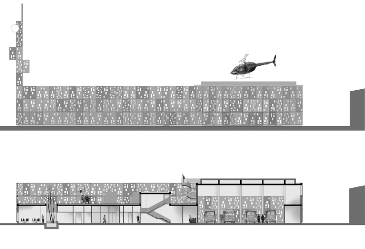 The fiberglass, proposed for the helipad’s structure and the pavement , the communication tower structure and the ventilated facade offer a series of qualities that makes it convenient, such as: high mechanical performance, light weight, easy transformation, 0 maintenance, corrosion resistance, UVA protection, thermal and electrical insulation , sunlight permeability, electromagnetic transparency, plastic possibility of pigmentation, etc.