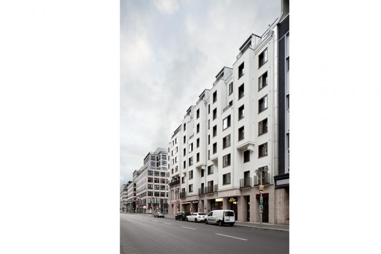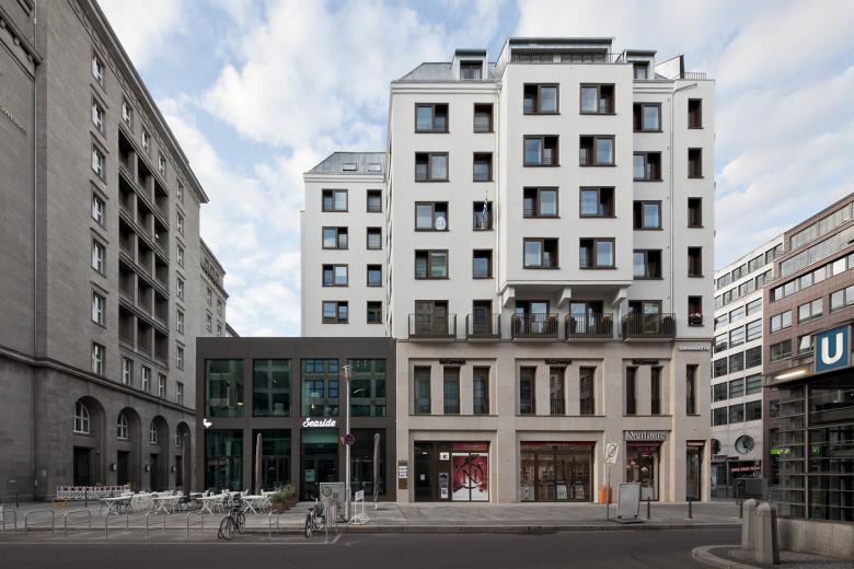 The corner Friedrichstrasse/ Mohrenstrasse presents a new face. In the course of the energetically redevelopment, the facade of the office- and residential building was completely renewed, including high quality wooden windows and a new roof cladding. New retail spaces replace the former arcades. The complex was extended by a new building accomodating a Restaurant. The old and the new are internally connected and the facade opens up to the Mohrenstrasse , offering the restaurant guests an open view through large scale windows.