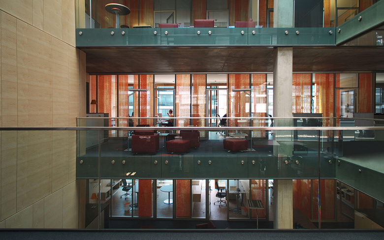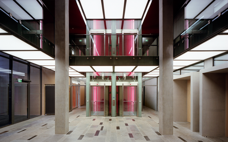 Auf 7 Geschossen werden die verschiedentlich nutzbaren Büroflächen durch individuelle Fensteröffnungen natürlich be- und entlüftet. Sie gruppieren sich im Gebäude um einen zentralen verbindenden Luftraum, der die vorgeschalteten offenen Kombibereiche mit Frischluft versorgt.
