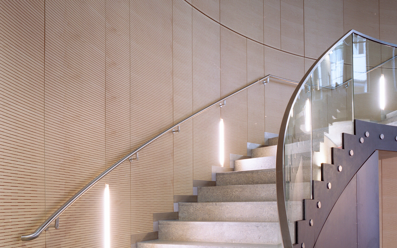 Zwei vollverglaste Stege verbinden den Neubau in unterschiedlichen Ebenen direkt mit dem Haupthaus. Deren mit Bambusmotiven bedruckte Gläser schaffen einen gestalterischen Bezug zur darunter liegenden Außenanlage.
