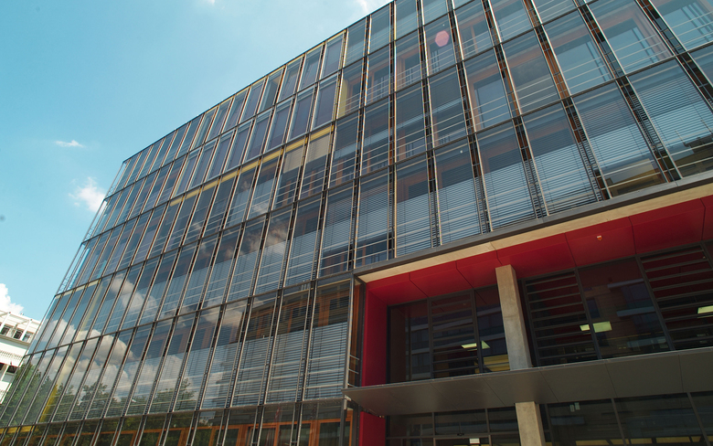 Der Neubau wird von einer hoch transparenten Hülle umschlossen, um den Gedanken zeitgemäßer offener Arbeitsformen nach außen zu dokumentieren. Süd- und Westseite des Gebäudes werden durch eine Doppelfassade eingehüllt, die sich durch farbige in den Fassadenzwischenraum einstülpende Erker gliedert. Der so geschichtete Glaskörper folgt süd- und westseitig den Konturen der Grundstücksgrenzen und erzeugt eine spannungsreiche Überformung der südwestlichen Gebäudeecke.