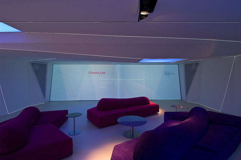 Das iHomeLab ist eine interaktive Testumgebung für die neusten Technologien im Bereich Intelligentes Wohnen. Sie bietet als schweizer Kompetenzplattform gezielten Raum zur Entwicklung, Präsentation und Prüfung von Szenarien und Anwendungen zum Thema vernetzte Haustechnik. Die Fassade wirkt als Metapher für das Innenleben des iHomeLab. Proaktiv bespielt und auf die Besucher reagierend, erfült die Gebäudehülle eine Signalfunktion für das ganze Thema Intelligentes Wohnen.