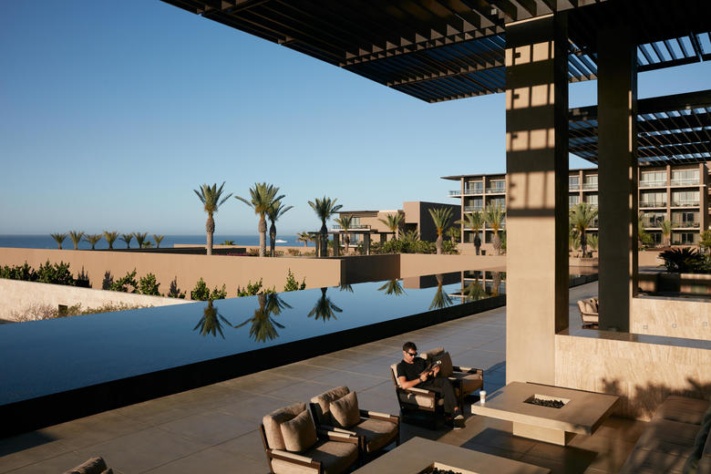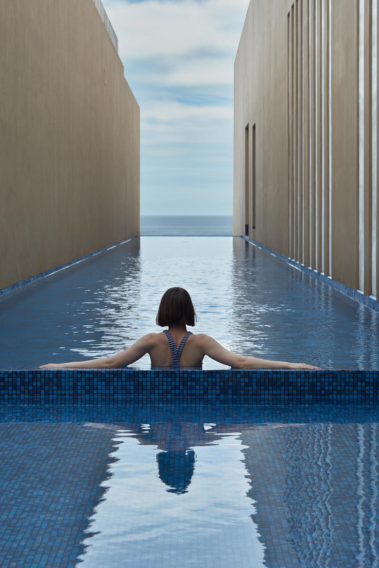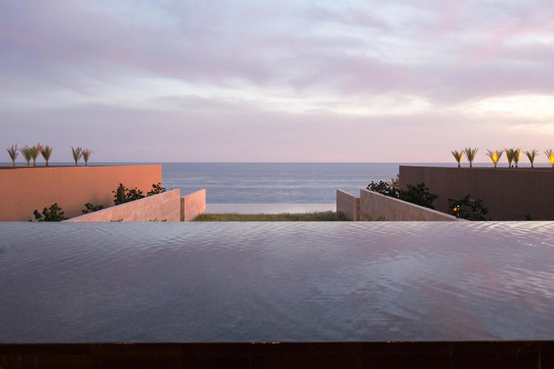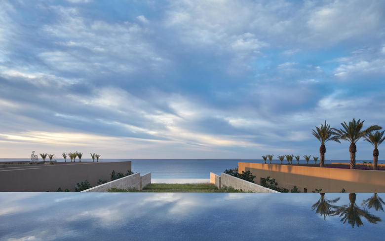 The grandeur of the 299-room, 561,000-square-foot resort is honed to an intimate scale starting with the entry hall where a cadence of tall columns inspired by pre-Columbian architecture draws visitors forward. Just past the main entry, two separate infinity pools appear to join, creating a visual connection to the ocean beyond. The horizon takes center stage from nearly every place in the resort. As guests move throughout the property, they are greeted with unexpected views of the water, framed by native landscaping.