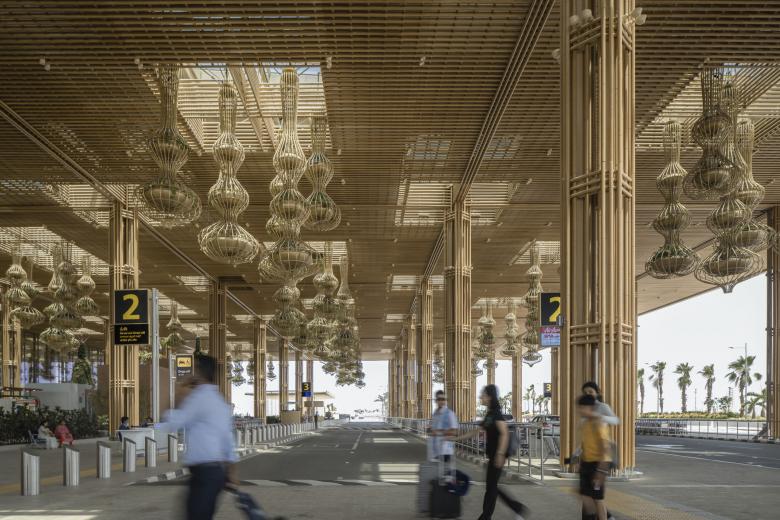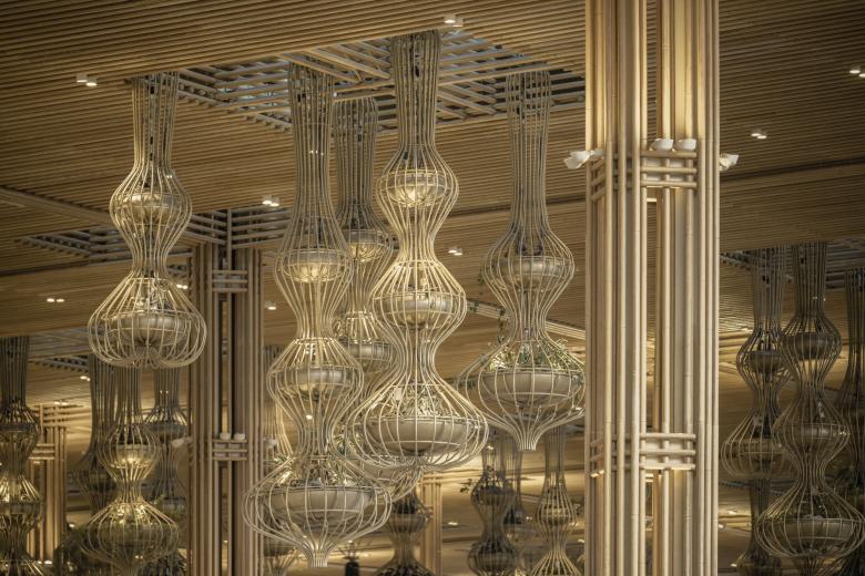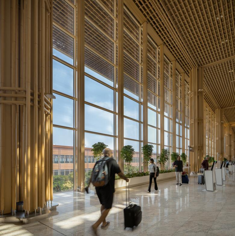 The structural system of Terminal 2 was designed with two primary goals: to achieve sustainability through structural efficiency, and economy through modularity. The result is one of the lightest terminal roofs in the world at this scale, made entirely out of domestically produced materials and built with local construction technology. The roof above the check-in and retail halls features long-span steel moment frames, which are supported by steel columns spaced 18 meters apart. The columns consist of the four individual posts that are clad in bamboo and linked together, creating that feeling of lightness in the structure. Because air travel is a constantly evolving industry, the consistency of the grid of columns will also allow for utmost flexibility to accommodate changes over time.
