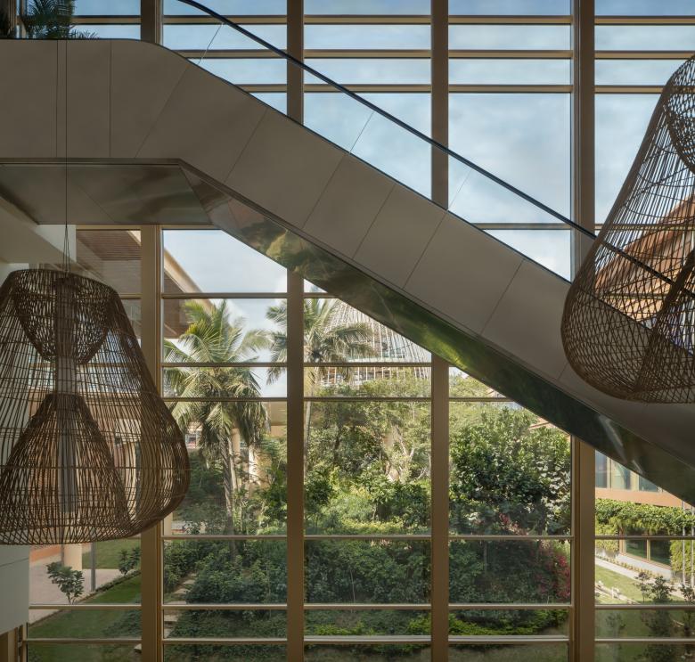 The terminal creates a radically different airport experience for passengers. A new multimodal transit hub—an outdoor space simultaneously serving as a retail and event hub right in front of the terminal—reimagines the role an airport can play in a city. From this transit hub, through the entrance, and extending to the gates, the terminal is both humanist and rooted in nature. Throughout the complex, interior plantings, exterior gardens, and rich natural materials weave the experience of nature into travelers’ journeys. Clad in brick, engineered bamboo, and glass, the complex consists of a set of interconnected buildings tied together by a continuous band of outdoor, landscaped spaces designed in collaboration with Grant Associates and designers Abu Jani/Sandeep Khosla—a “terminal in a garden” that nods to Bengaluru’s reputation as the “garden city.”