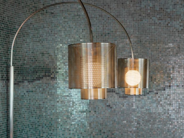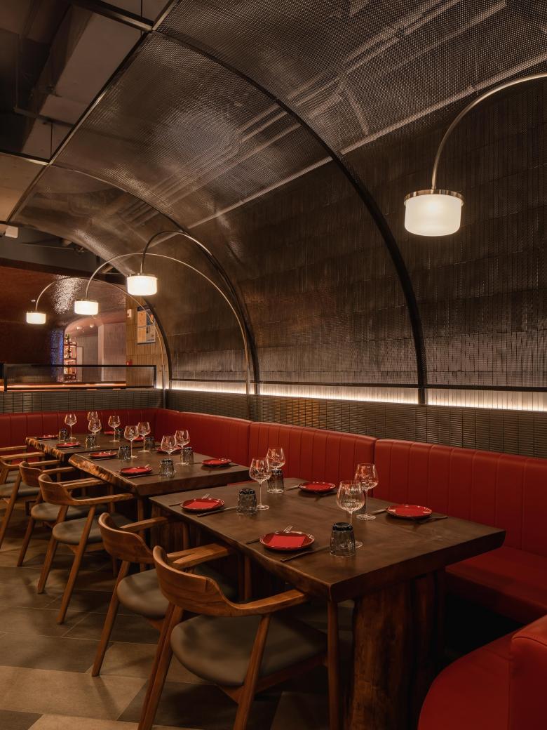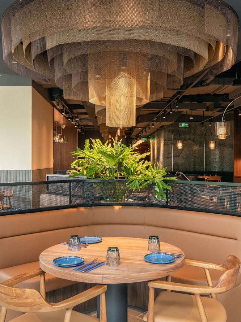 The unique shape of the space creates two entertainment wings fanning out from the central hub. A quieter dining space off the action-filled bar area allows for a more refined restaurant experience. Two “chefs tables” adjacent to the kitchen sit under a large arched mesh form with custom lighting and a soft glowing wine wall. The main restaurant is a light-filled and bright space with hues of blue and cream plastered walls. Layered mesh winds down the centre of the ceiling, weaving into a large layered circular piece. Banquette seating wraps around the curved windows under large arched perforated steel lamps. The layers of perforated steel and mesh play with the light to bring softness to the material. The second wing of the building is dedicated to VIP suites. Dark and moody, each suite features a golf simulator, KTV, dining and lounge area. The end of the wing contains the premium VVIP suite, the ultimate entertaining suite. A large blue velvet banquette lounge wraps the suite simulator, with dining space and high table leaners completing this well-designed private room.