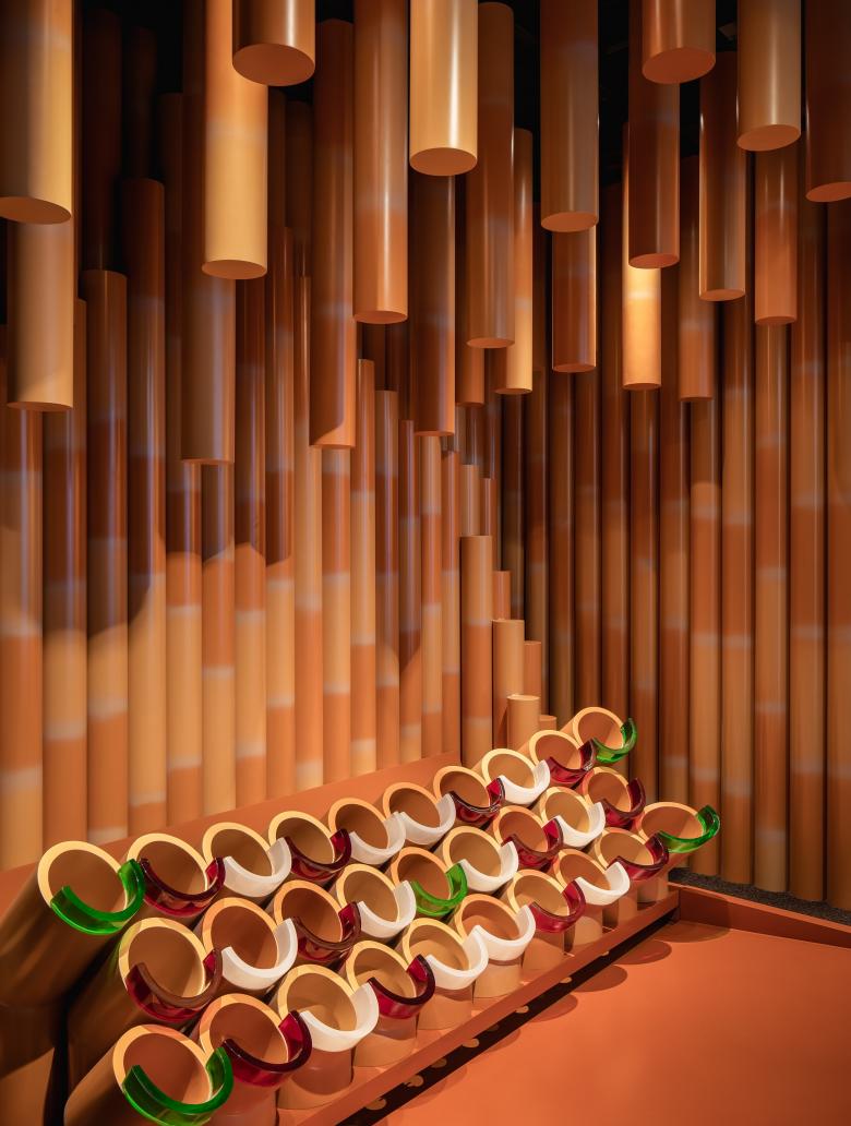 A large LED at the end and directional flooring lead you towards the action. Emerging into the open space, you are drawn to a glimmering red bar curving up the wall and ceiling, wrapping the space with its flowing form. Not your typical sports bar, the space is refined yet comfortable with cosy booths, lounge areas and softened custom lighting. The minigolf fills the opposite side of the central hub. Taking cues from Chinese art and landscape, an inviting palette of bold colours, light and form entices and draws you into its world. The nine-hole golf course’s eye-catching design creates plenty of photo moments. Centred between the bar and minigolf are the two open swing suites. The metal mesh curtains provides flexibility and privacy, allowing for people to see and be seen playing the multiple interactive games.