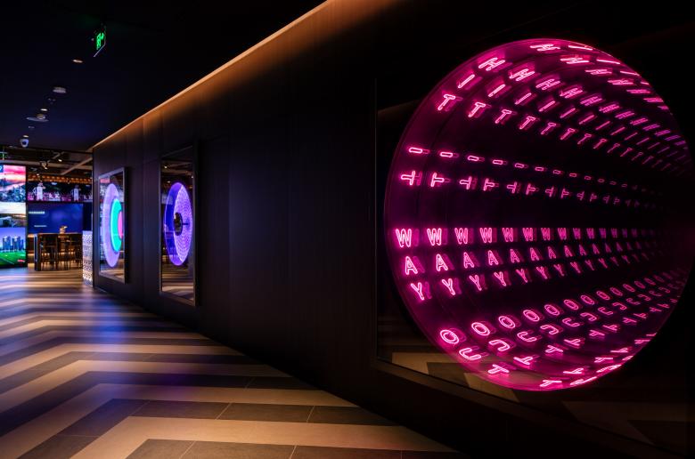 Lounge by Topgolf is an expansive 2,700sqm space, featuring a bar, restaurant, open suites, VIP rooms, and minigolf with each area carefully zoned through materials and textures to create a balance of open and intimate entertainment spaces. The Topgolf experience begins as you travel through a long, darkened corridor that builds anticipation as you enter the space. Large bright, circular art installations mimic the movement of a golf ball, providing playful moments of interaction and pause.