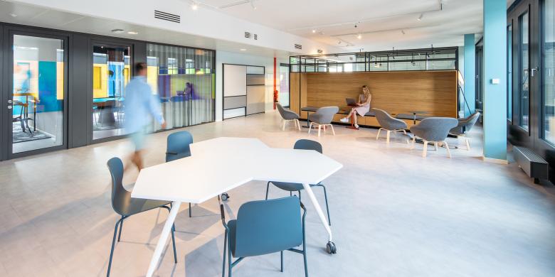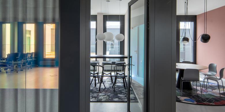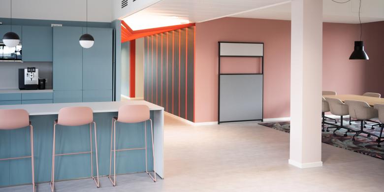Die Einrichtung und Ausstattung der Räumlichkeiten stärkten das Teamwork von Beginn an. In diesem Office-Space fällt die Einarbeitung und Integration neuer Mitarbeiter viel leichter, die Stimmung ist sympathisch und locker. Der intelligente Mix aus agilen Gemeinschafts- und Kreativitätsräumen stärkt die Zusammengehörigkeit. Auch die Farbkombination, für die sich Maxon entschieden hat, nimmt die Stimmungswelt des Unternehmens gekonnt auf. Von Blau bis Beige – das fast futuristische Farbkonzept der Räumlichkeiten des Unternehmens spiegelt die „Virtual Identity“ der Marke wider: Dabei ließ sich CSMM vom ursprünglichen Gebäude, einer alten Villa mit Pool, inspirieren. Diese erinnert an Meer und Strand und vermittelt dem Team somit ein gewisses Freiheitsgefühl. Transparente Glasdesign-Folien mit farbigen Regenbogeneffekten an den Wänden sorgen für wechselnde Farbstimmungen und -illusionen im Raum. Die Auswahl des Themas erfolgte unter Beteiligung des Teams. Für sie wollten wir eine entspannte Atmosphäre kreieren. Unser Ziel war dabei, ein Raumkonzept zu gestalten, das sich leicht an allen Standorten reproduzieren lässt, sodass sich jedes Teammitglied weltweit mit dem Unternehmen und seinen Wurzeln verbunden fühlen kann.