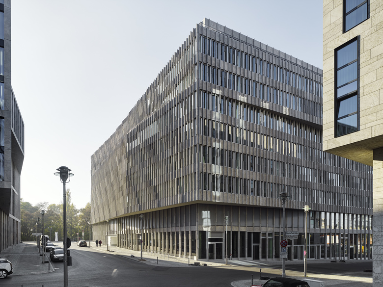 In der Bertha-Benz-Straße unmittelbar südwestlich des Berliner Hauptbahnhofs und gegenüber des Neubaus für das Bundesministerium des Inneren entstand als vierter und letzter Baustein des so genannten ‚Lehrter Stadtquartiers‘ ein neungeschossiges Bürogebäude mit gut 25.000 m2 BGF. Das Haus steht im direkten Dialog mit den drei anderen Bausteinen des Ensembles, für das klare Regeln zu Gebäudeform, Höhe und Materialität vorgegeben waren. Gleichzeitig erhält es durch seine Fassade aus filigranen Naturstein-Finnen ein eigenständiges, elegantes Erscheinungsbild.