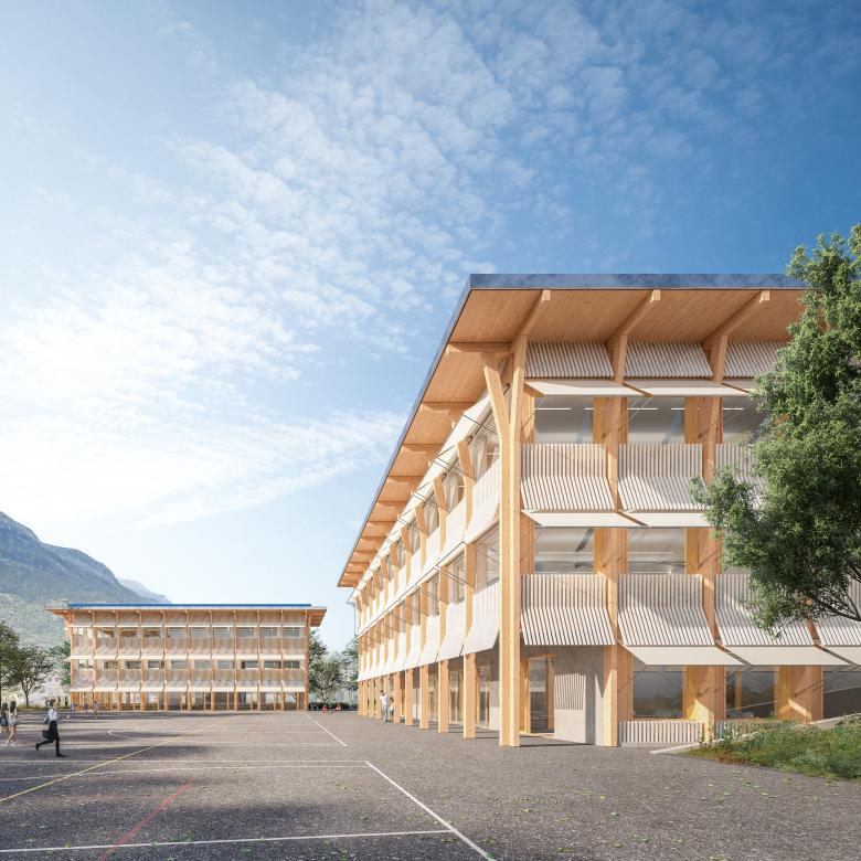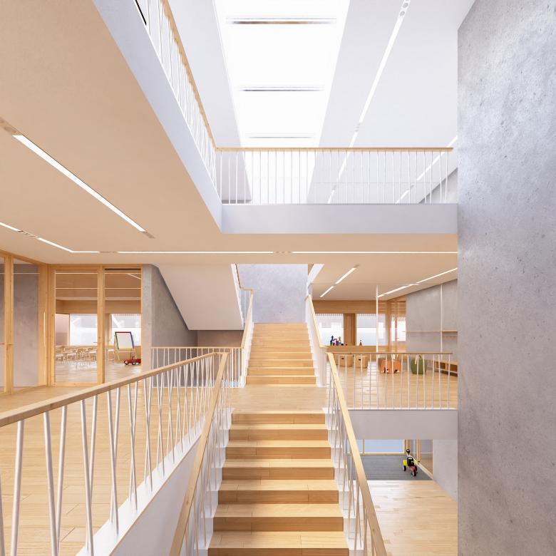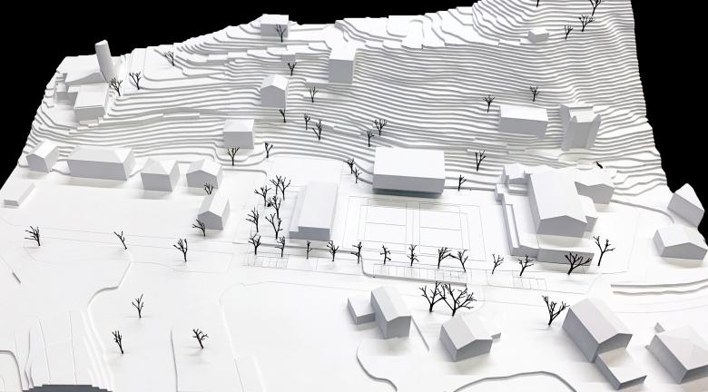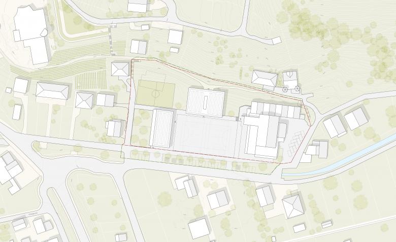 Es sind zwei kompakte, charaktervolle Baukörper geplant: die Primarschule und die Kita/Tagesschule. Die neuen Bauten gliedern sich als Ensemble selbstverständlich in die organisch gewachsene Dorfstruktur und fügen sich gezielt in die markante Landschaft ein. Zusammen mit der bestehenden Turnhalle definieren sie die differenzierten Aussenräume; den grosszügigen Pausen- und Sportplatz auf der Südseite, das grüne Sportfeld an der nordwestlichen Ecke und etwas abgeschirmt den Garten der Kita/Tagesschule im Westen. Der Pausenhof wird die zentrale Drehscheibe des Komplexes, die sämtliche öffentliche Gebäude erschliesst und verbindet. Die Neubauten schaffen eine interne Erschliessungs-achse, welche die Turnhalle, die Schule und die Tagesschule mit kurzen Wegen verbindet. Die Primarschule ist entlang dieser Achse am Hang positioniert und schafft bergseitig eine Verbindung mit dem neu entstehenden Fussweg. Dieser Bezug zum Hang wird in der inneren Erschliessung als Promenade weiter thematisiert. Die Kita/Tagesschule ist senkrecht zur Schule im Südwesten positioniert und markiert mit ihrem Volumen den Hauptzugang zum Areal. Der Zugang zur Kita sitzt - leicht abseits der Haupterschliessung - in der direkten Nähe der Allee, sodass Eltern ihre Kinder mühelos bringen und abholen können. Der Perimeter «Umgebung» entlang dem Rottenbett wird als lineare Park- und Zubringerzone mit einer Baumallee gestaltet und wirkt als Filter zum Schulareal.