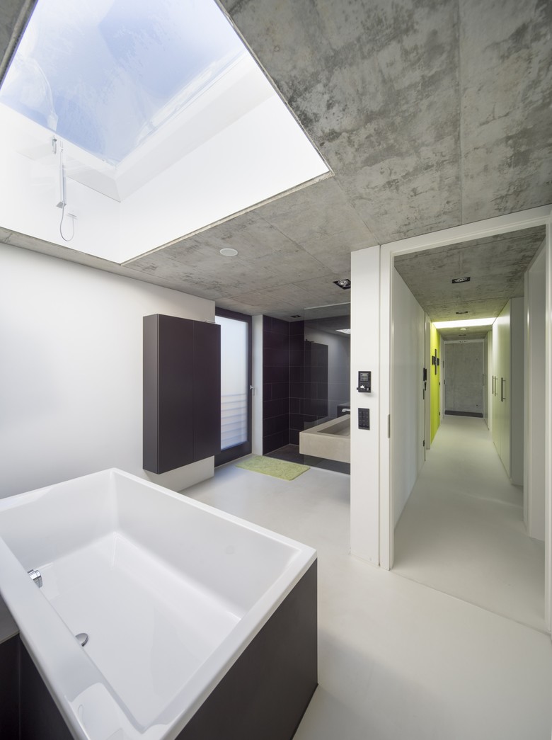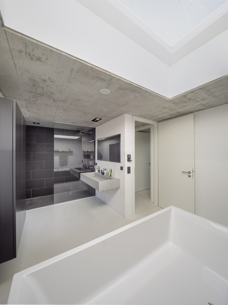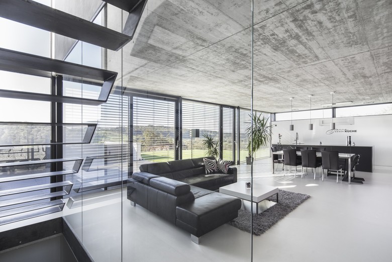 Der Wohnbereich wiederum wird von einer grau verputzten Wand in einer L-Form umschlossen welche jedoch vollständig durch eine Glasfuge vom weißen Band getrennt ist.