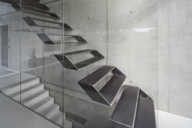 Das Gebäudeinnere wird klar in eine dienende und in eine bediente Zone im EG und OG aufgeteilt. Die Geschosse werden über Treppen welche sich in der Fuge auf der Ostseite befinden verbunden. Um eine möglichst große Transparenz in Längsrichtung der Fuge zu Gewährleisten wurden die Treppenstufen als Stahlkisten in die Betonwand gedübelt, was dazu führt, dass sie in Längsrichtung nur eine minimale Ansichtsbreite aufweisen.